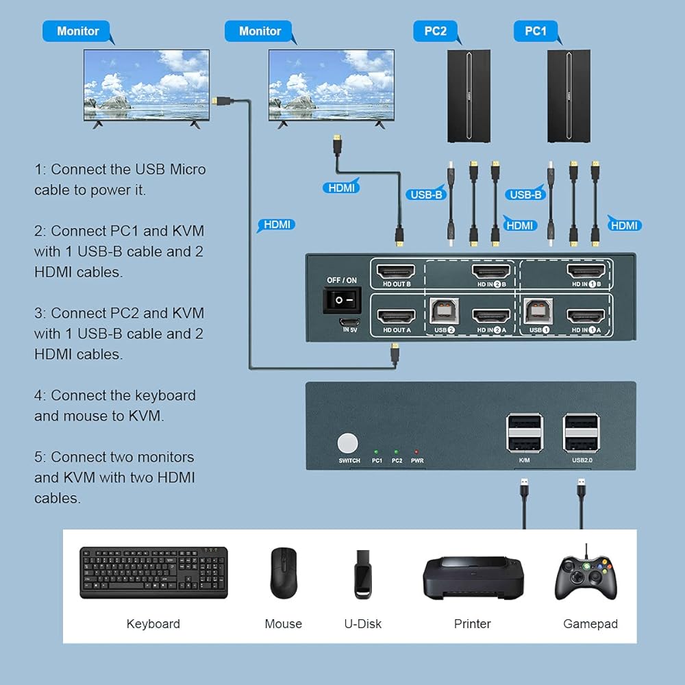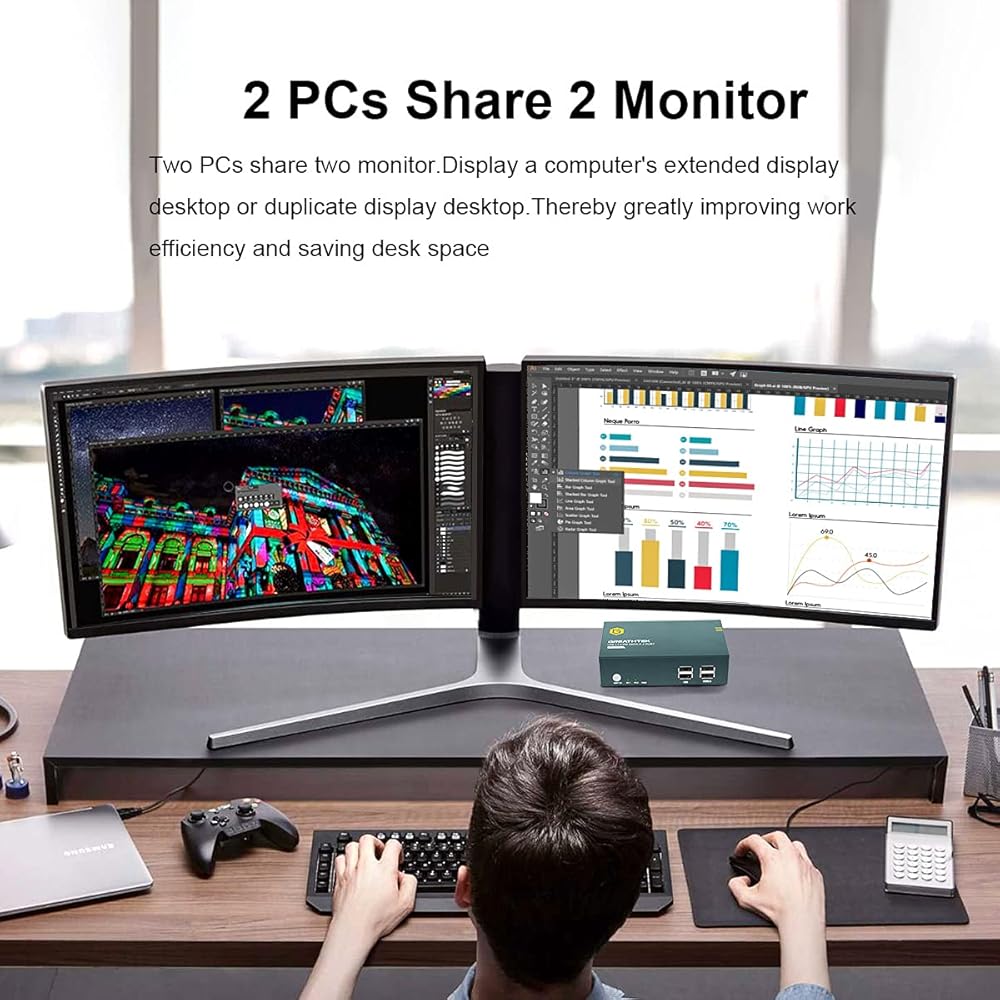 التوافق العالي، مطابقة أجهزة متعددة: يحتوي هذا المحول على منفذي USB 2.0، اللذين يمكنهما مشاركة أجهزة USB، مثل الماسحات الضوئية أو طابعات USB أو أقراص U، ويمكنه التعرف على أجهزة العرض المختلفة ومطابقتها تلقائيًا. متوافق مع مجموعة متنوعة من أنظمة الكمبيوتر، ويمكن استخدامه على نطاق واسع في التعليم والمكاتب وغيرها من المجالات.