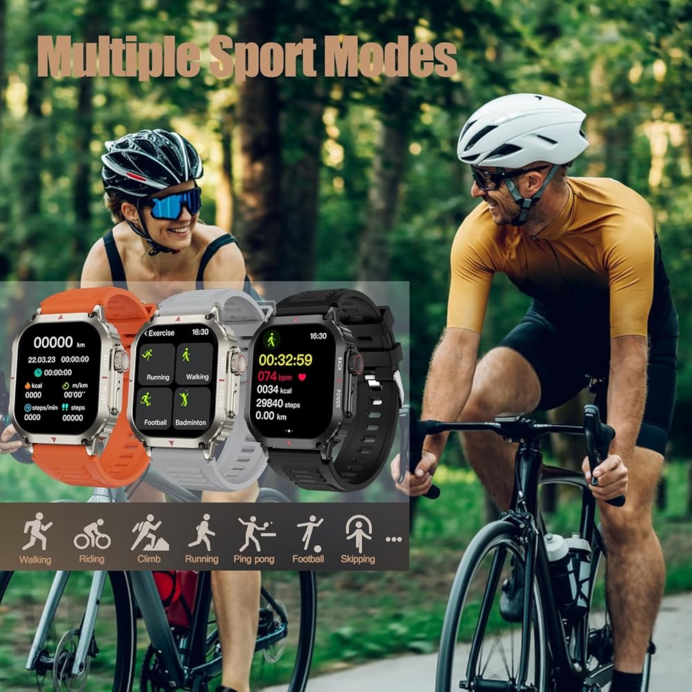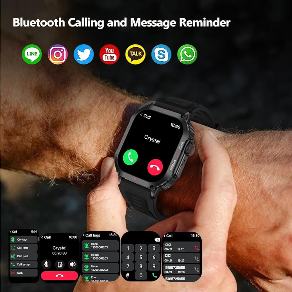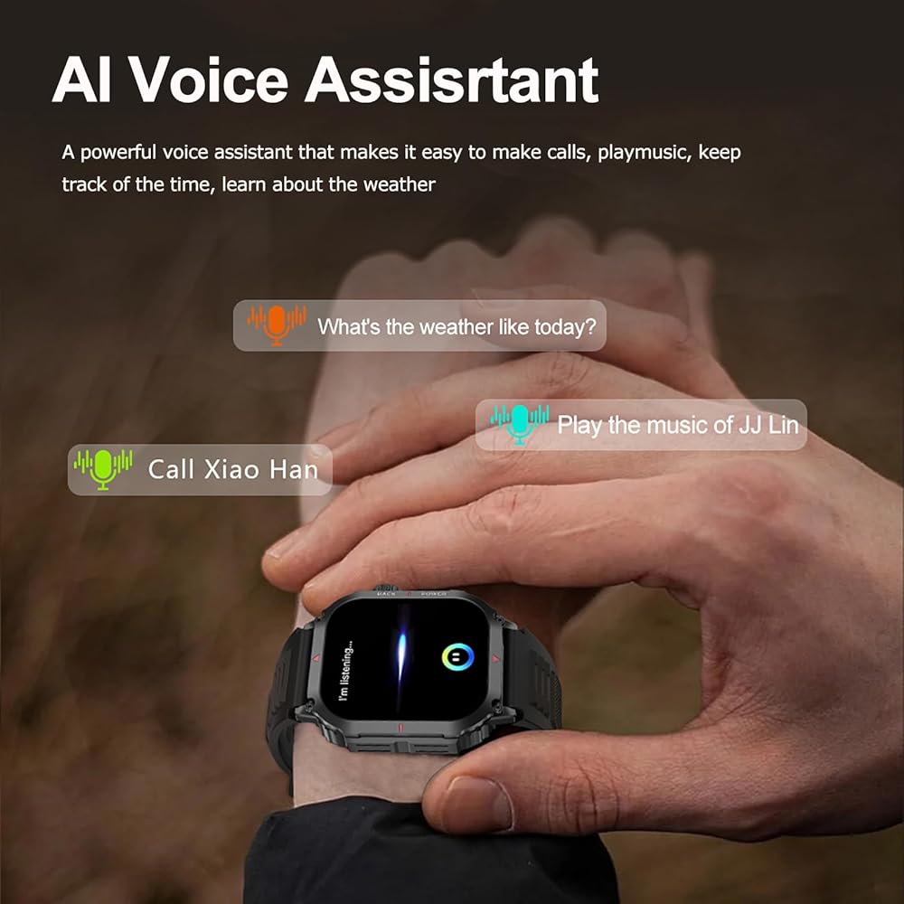 • إجراء/الرد/رفض المكالمات وتذكير الرسائل: تحتوي هذه الساعة الذكية على مكبر صوت هاي فاي مدمج وميكروفون يسمح لك بإجراء/استقبال المكالمات وتشغيل الموسيقى مباشرة من ساعتك الذكية. يمكن للساعات الذكية للرجال تلقي إشعارات من تطبيقات مثل Facebook وWhatsApp والرسائل النصية القصيرة ووسائل التواصل الاجتماعي والتي يمكنك مشاهدتها مباشرة على ساعة اللياقة البدنية دون الحاجة إلى إخراج هاتفك. مساعد صوتي يعمل بالذكاء الاصطناعي لإجراء المكالمات الهاتفية والتحقق من الطقس وتشغيل الموسيقى بأمر صوتي فقط