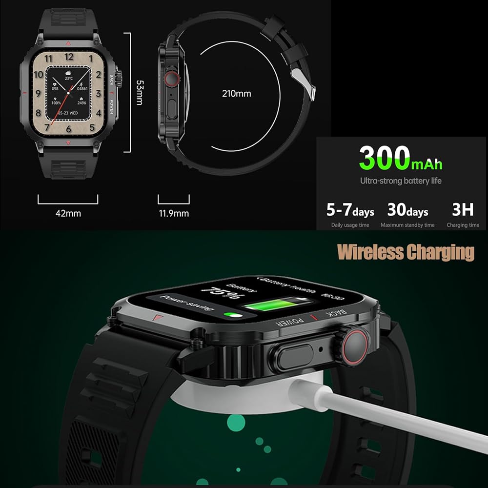 • ساعة ذكية للشحن اللاسلكي والمزيد من الأدوات المساعدة: تحتوي الساعة الذكية القوية والمتينة على بطارية مدمجة بقوة 300 مللي أمبير في الساعة، والتي يمكن شحنها بالكامل خلال ساعتين، وما يصل إلى 20 يومًا من الاستعداد و5-7 أيام من الاستخدام النشط. IP68 مقاوم للماء. تتوافق هذه الساعة الذكية للرجال مع معظم هواتف Android وiOS المتوفرة في السوق (iOS 9.0 فما فوق وAndroid 4.4 وما فوق). أدوات عملية أخرى: المنبه، التقويم، ساعة التوقف، التحكم في الموسيقى، العد التنازلي، NFC، جزيرة Lingdong، الآلة الحاسبة، التنفس، وما إلى ذلك.