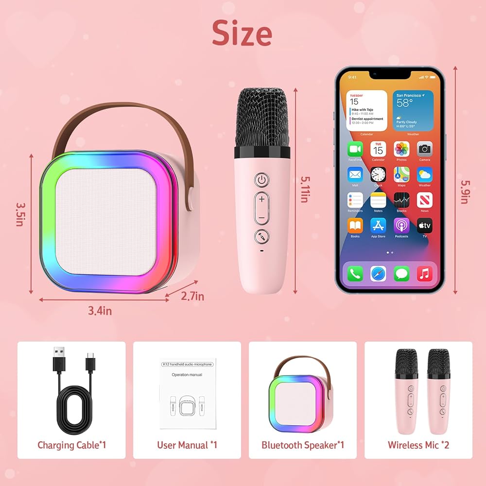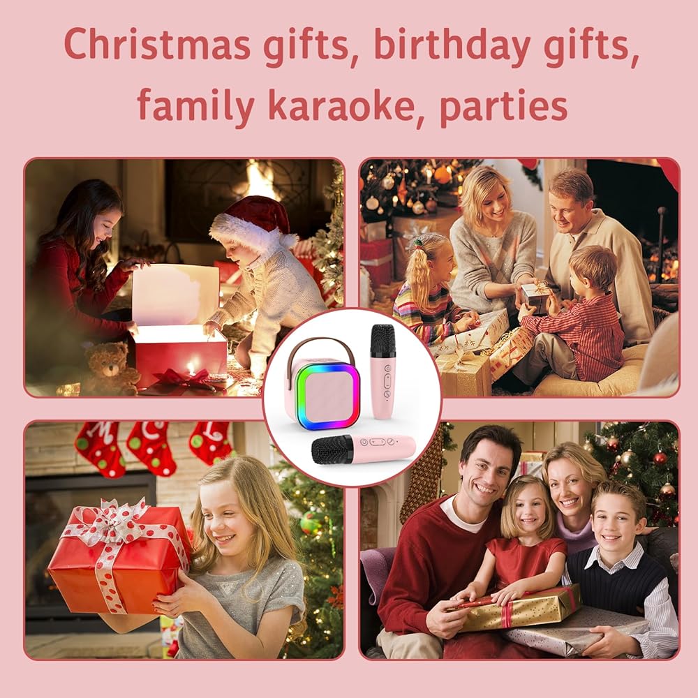 آلة كاريوكي مع 2 ميكروفونات لاسلكية، آلة كاريوكي صغيرة محمولة بلوتوث، مكبر صوت كاريوكي مع أضواء LED، ميكروفون للأطفال ألعاب هدايا عيد ميلاد للفتيات 3-12 سنة