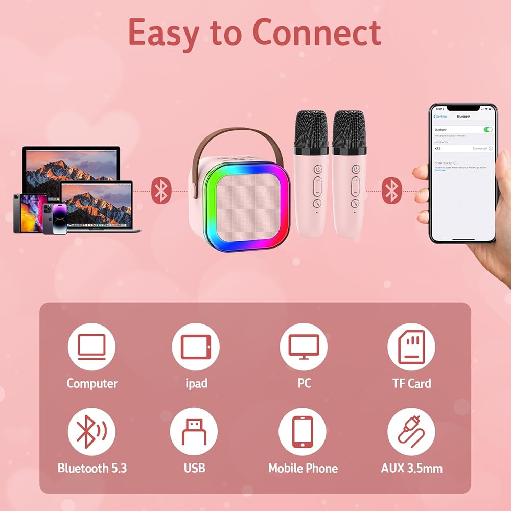 • ♬【آلة كاريوكي بلوتوث متعددة الوظائف】آلة كاريوكي للأطفال مع 2 ميكروفونات قابلة لإعادة الشحن. بلوتوث 5.3 مدمج، متوافق مع الهواتف المحمولة والأجهزة اللوحية ومشغلات MP3 وما إلى ذلك. بعد الاتصال بجهاز الكاريوكي الصغير اللاسلكي لأول مرة، سيتم توصيله تلقائيًا بمكبر صوت Bluetooth عند تشغيل الجهاز لاحقًا، مع استقرار يصل إلى نطاق 32 قدمًا، ويدعم TF مع تخزين أغاني MP3.