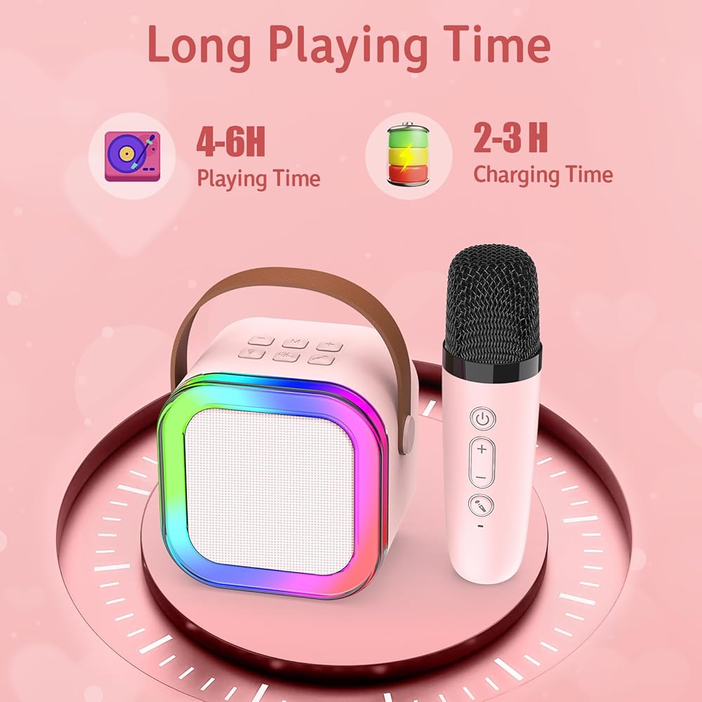 ♬ 【Multi-function Kids Karaoke Machine for Girls】Mini karaoke machine have colorful LED lights. The LED lights on the outside of the stereo dance to the rhythm of the music, creating a fun and enjoyable atmosphere. The Bluetooth karaoke machine for kids is perfect for singing, family karaoke, and small enough to take with you when travelling and on family camping trips.
