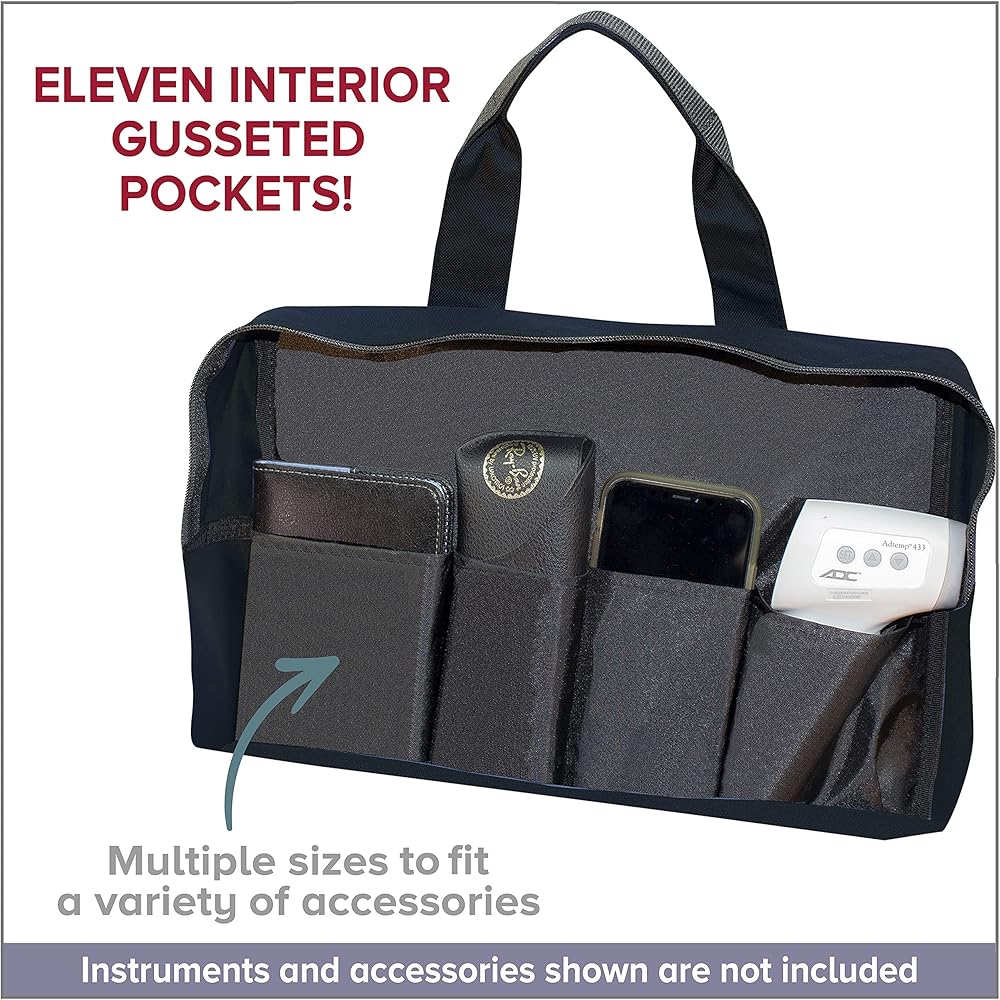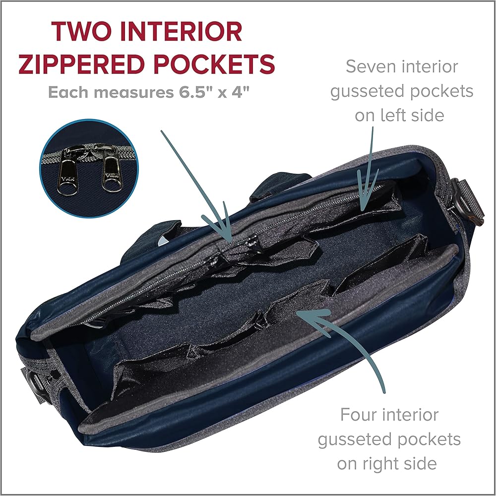 - حزام كتف منسوج قابل للتعديل والإزالة ومقبضين محيطيين لسهولة الحمل. 11 جيبًا داخليًا بأحجام مختلفة