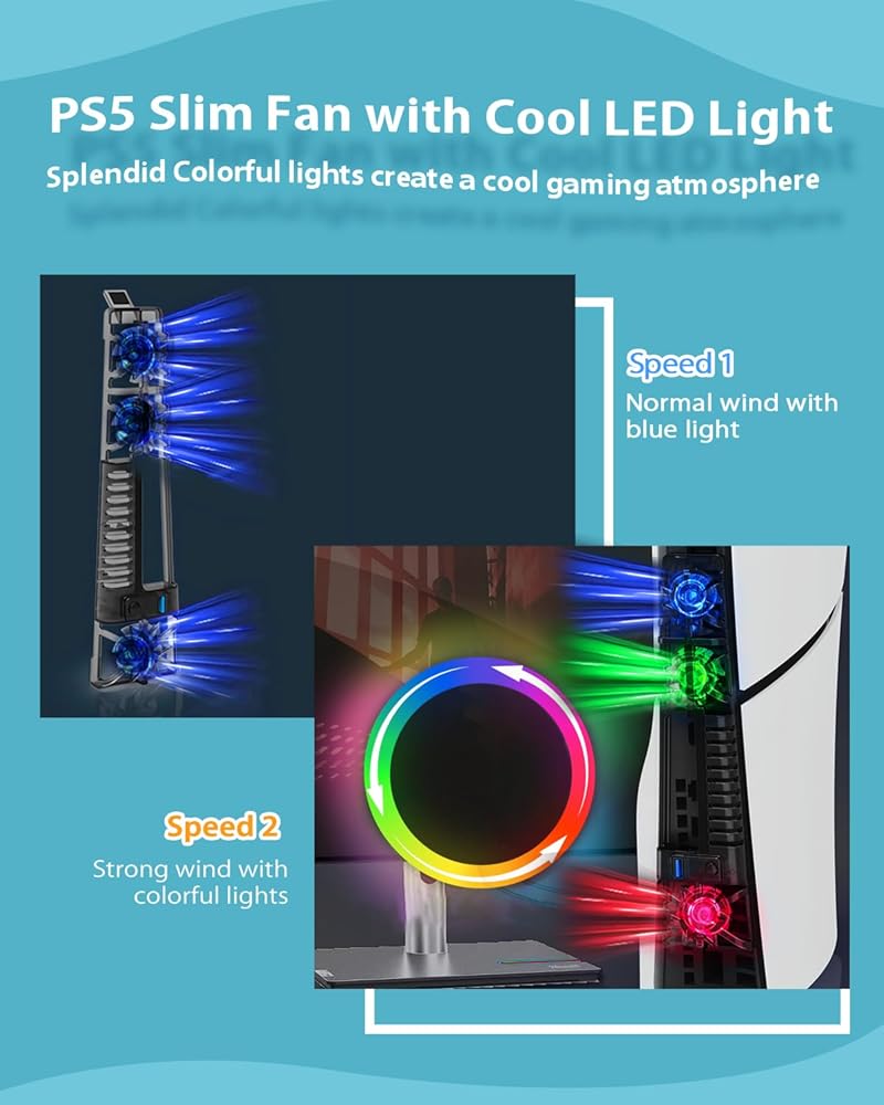 【Low Noise】The PS5 slim cooler is designed with 3 silent fan, which is low noise and high wind power. Effectively reduce noise to ensure your immersive gaming experience. Combined with Cooling fan, USB hub and Led Lights, this PS5 slim fan is a perfect accessory for your new PS5 console