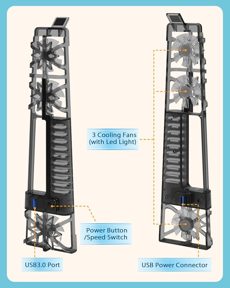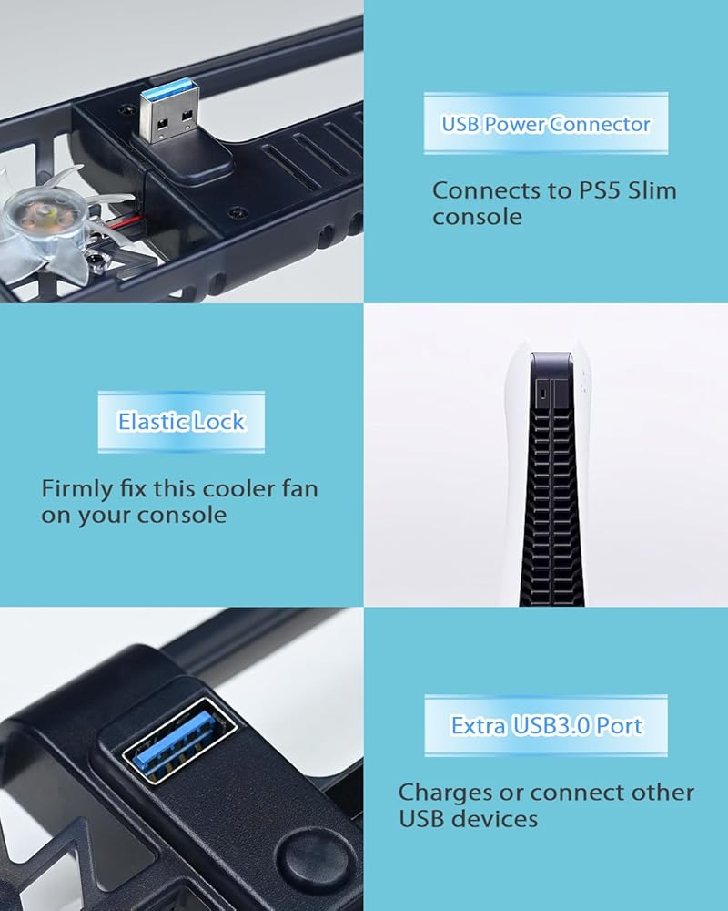 【Extra USB3.0 Port】The cooling fan for PS5 slim comes with an extra USB3.0 port, allowing you to conveniently connect or charge your controller, headphones, and other USB3.0 devices.