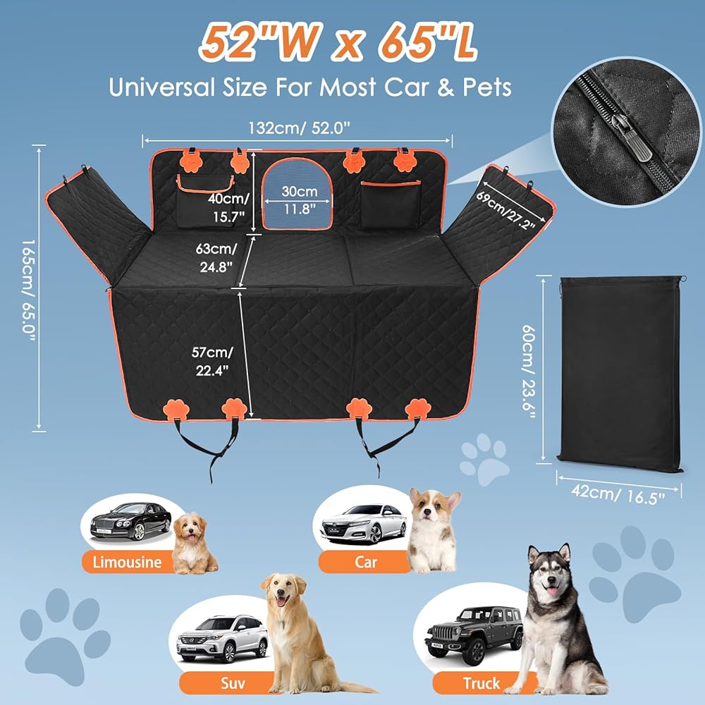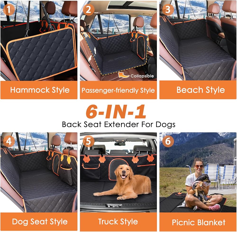 6-IN-1 Multifunctional CAR SEAT COVER: The latest upgraded dog back seat extender, with its universal size of 52"W x 63"L, can be transformed into 6 styles: Hammock, Passenger-friendly, Beach, Dog Seat, Truck, and Picnic Blanket, suitable for various scenarios, back seat dog cover fits cars, trucks, and SUVs. The versatile back seat protectors make great gifts and accessories for every pet owner