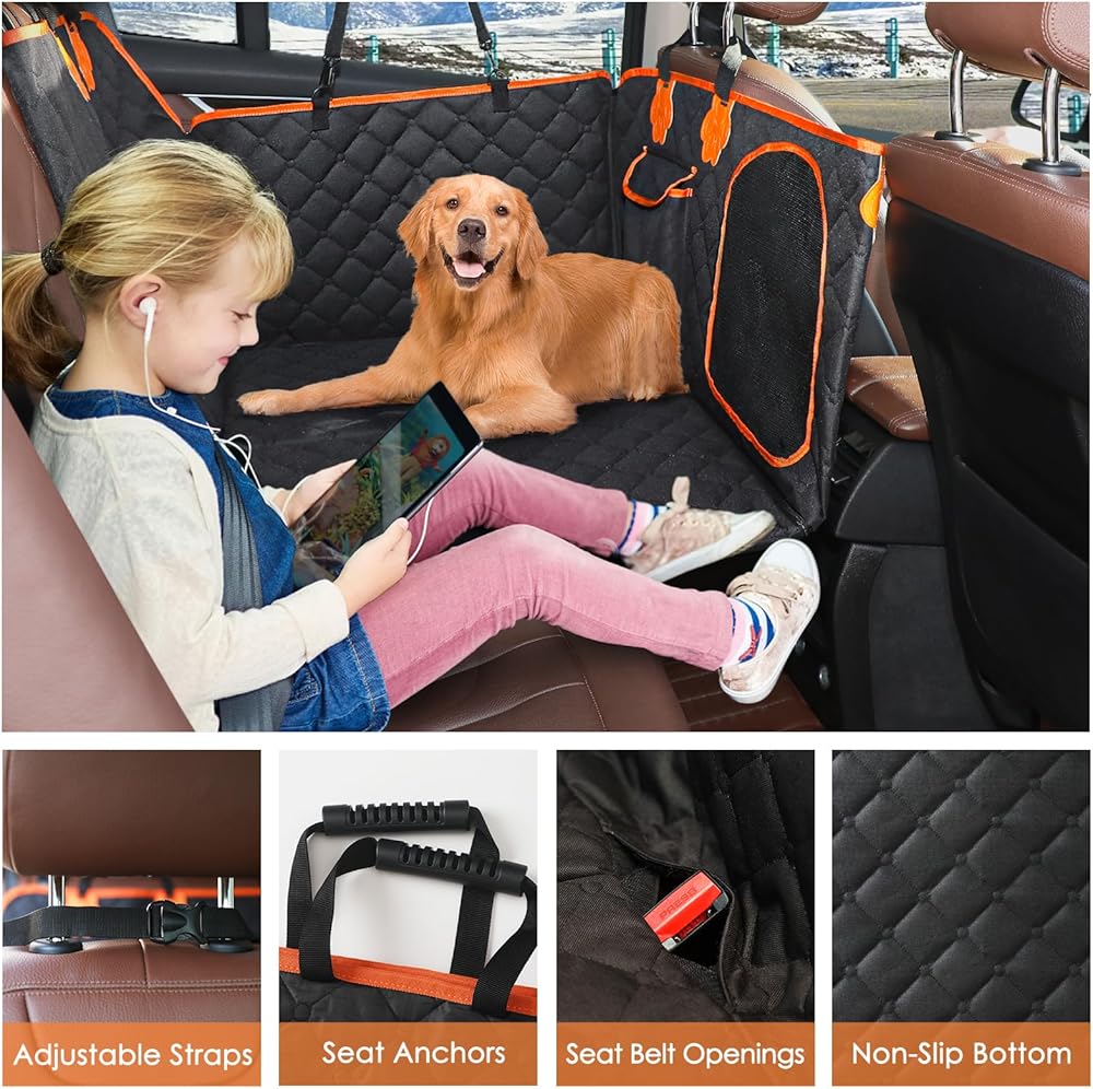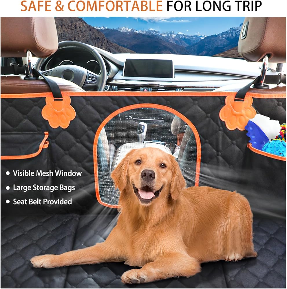 DOG BACKSEAT COVER WITH MESH WINDOW & STORAGE POCKETS: The back seat pet cover for dogs features a mesh window that allows fresh air circulation from the front, ensuring your dog stays cool in the summer. Additionally, pets can see their owner through it, which helps keep them safe and reduces anxiety during road trips. This dog back seat extender also includes two large capacity pockets for storing your pets' supplies. Take your pets on a safe road trip with this vehicle accessories
