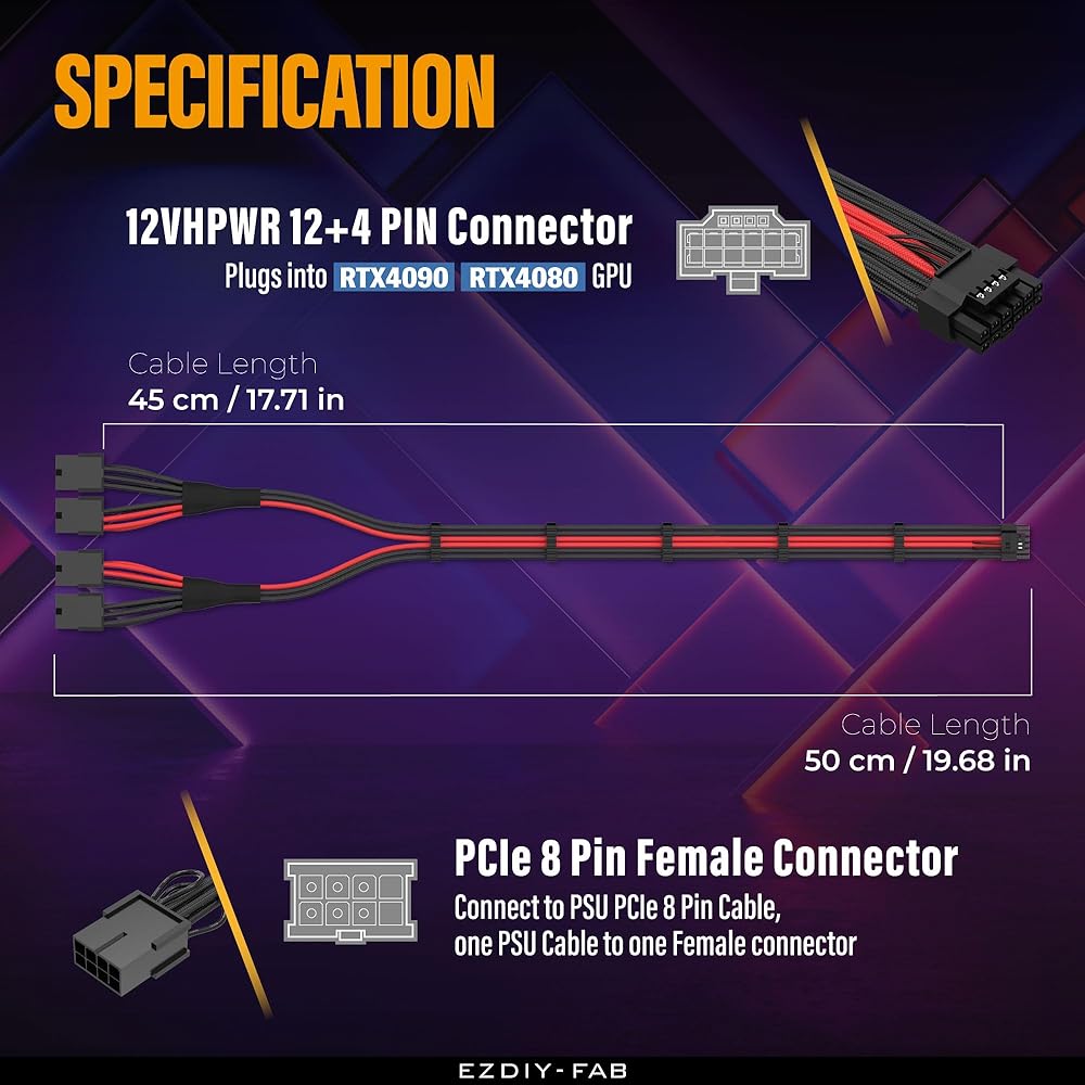 هذا الكابل هو كابل تمديد فقط. من فضلك لا تقم بتوصيله مباشرة إلى PSU الخاص بك. يرجى استخدام مصدر طاقة بقدرة كافية وفقًا لتعليمات الشركة المصنعة. بشكل عام، يوصى باستخدام وحدة PSU بقدرة 1000 واط أو أكثر لتتناسب مع بطاقة الرسومات RTX4090/4080/3090ti.