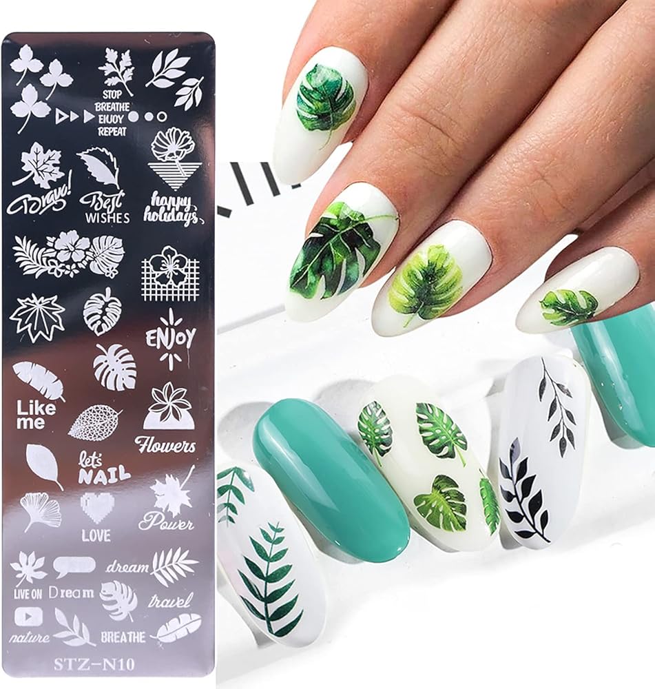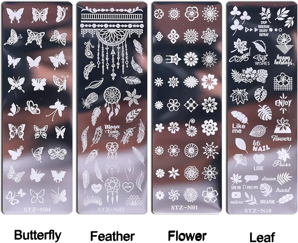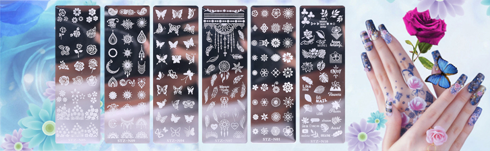 【التصميم】: 6 قطع من ألواح الأظافر مع مجموعة متنوعة من الأنماط، بما في ذلك الكلمات والفراشة والزهور والريش وأوراق القيقب والورد وغيرها من الأنماط لتلبية احتياجات الديكور المختلفة التي تصنعها بنفسك.