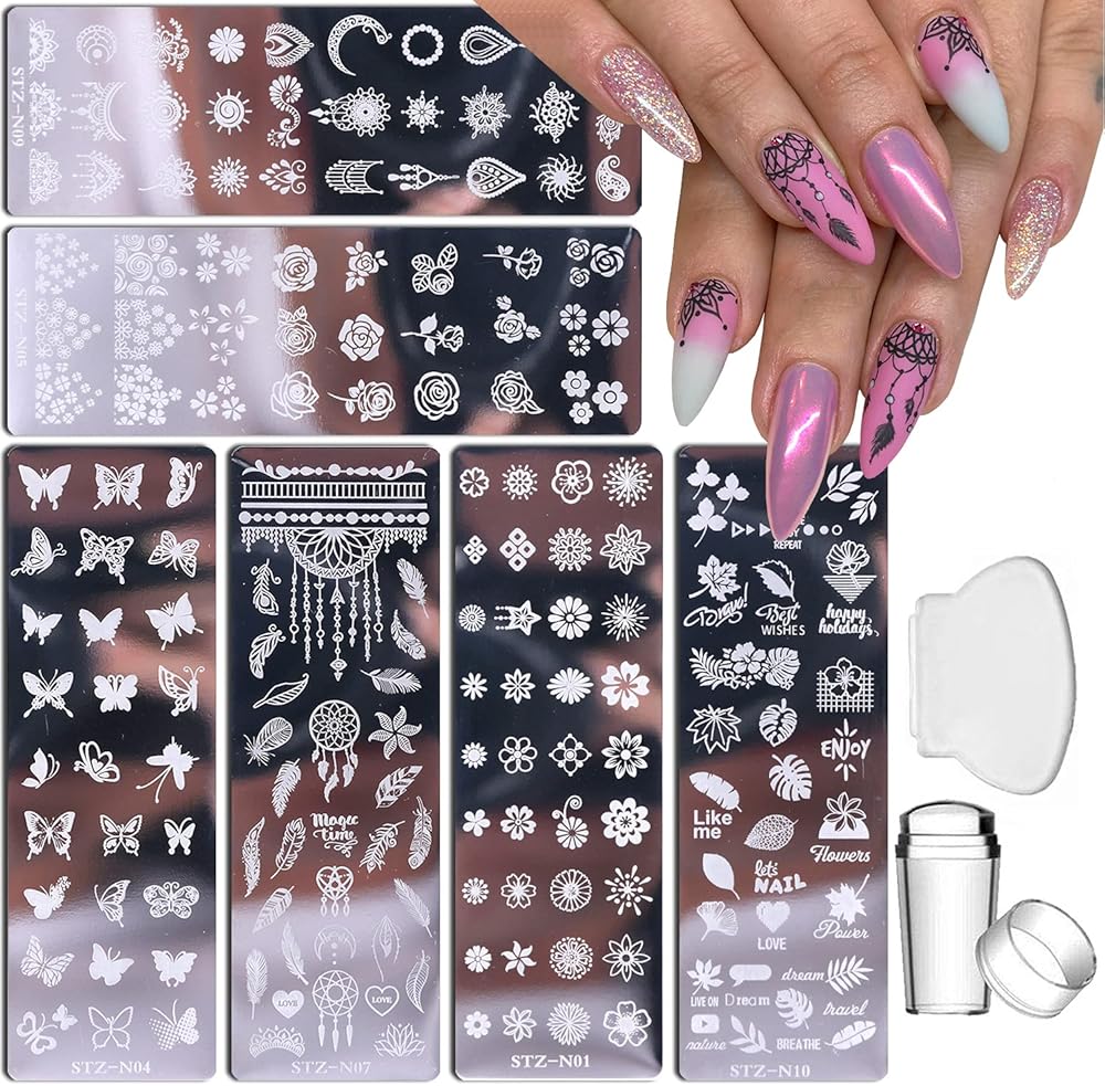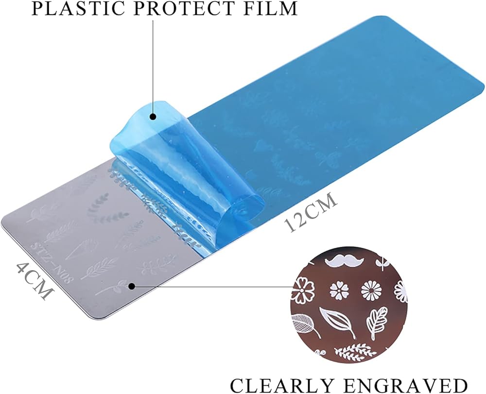 【مجموعة مثالية】تتضمن مجموعة ختم فن الأظافر الخاصة بنا 6 قطع من لوحات ختم الأظافر، 1 ختم، 1 مكشطة دانتيل، وحجم كل لوحة ختم 4.77 × 1.57 انش (التعليمات المرفقة)