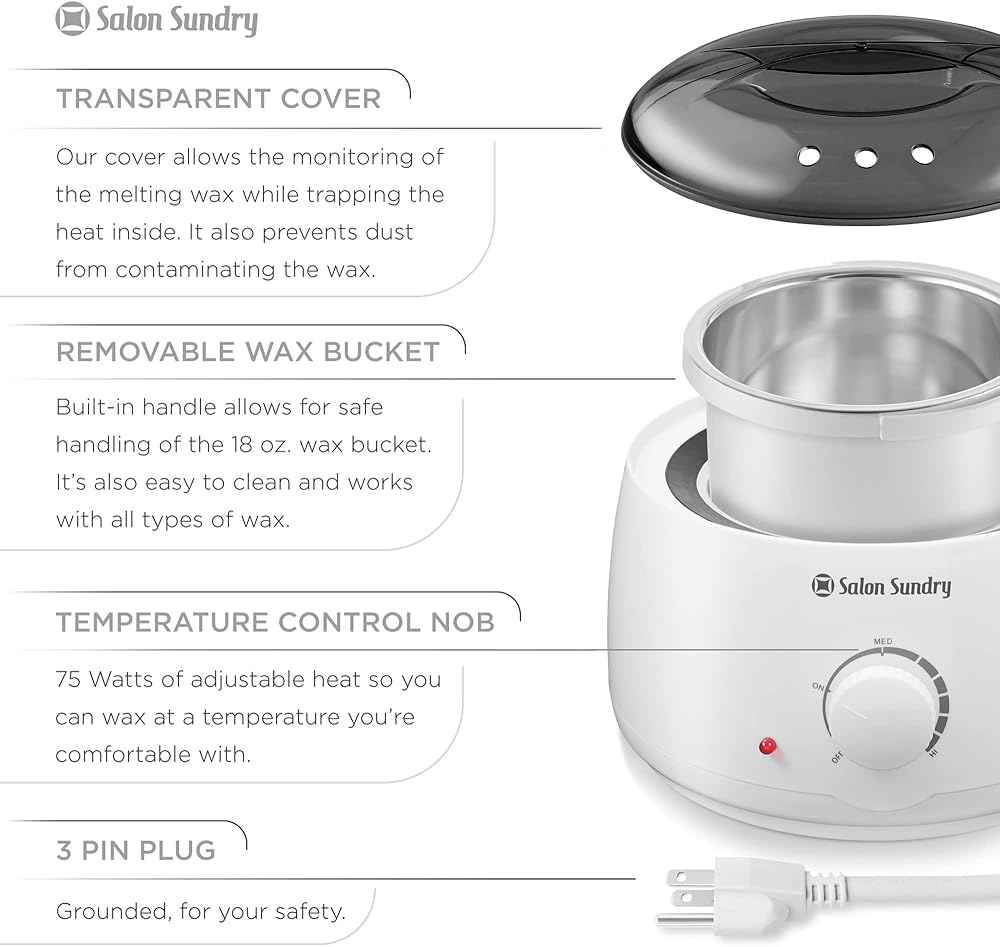يعد سخان الشمع الفاخر هذا من Salon Sundry مزيجًا مثاليًا من الأداء العالي والتصميم المريح، وهو مثالي لعلاجات الشمع ذات الجودة الاحترافية من الراحة والملاءمة في منزلك أو أثناء السفر. هذا السخان المدمج والمحمول والمتين للغاية مناسب لجميع أنواع إزالة الشعر والشموع العلاجية الأخرى، بما في ذلك البارافين. يتميز ببنية مركبة قوية وقوة تسخين تبلغ 75 واط، يتم توصيلها عبر عنصر تسخين دائري داخلي قوي مع إعدادات حرارة يمكن التحكم فيها من أجل ذوبان الشمع بسرعة. يمكن تعديل منظم الحرارة حتى يصل إلى 65 درجة مئوية (149 درجة فهرنهايت)، وخفضه للحفاظ على تناسق الشمع المثالي. يتميز جهاز التسخين بقطر قياسي صناعي يبلغ 4-1/8 بوصة، وتم تصميم غرفة التسخين الداخلية العميقة 2-1/4 بوصة لاستيعاب معظم حاويات الشمع، مثل الحجم القياسي 14 أونصة، والعلب الأخرى من نفس القطر. تشتمل الماكينة على بطانة وعاء شمع معدنية قابلة للإزالة للاستخدام مع الشمع السائب، والصب المباشر، وسهولة التنظيف. يبلغ قطر بطانة الوعاء 11.43 سم (من الداخل) مع شفة 1/4 بوصة وعمق 6.35 سم، وسوف تحمل ما يصل إلى 18 أونصة سائلة من الشمع، ولها مقبض معدني من أجل الراحة والأمان. توخي الحذر عند التعامل مع العناصر الساخنة. يوفر غطاء العرض الشفاف الرؤية لمراقبة ذوبان الشمع، مع الحفاظ على الحرارة ومنع التلوث. تتميز الماكينة بأقدام رغوية مضادة للانزلاق وغير قابلة للتشوه لحماية أسطح العمل والأسطح. الوحدة معتمدة من RoHS.