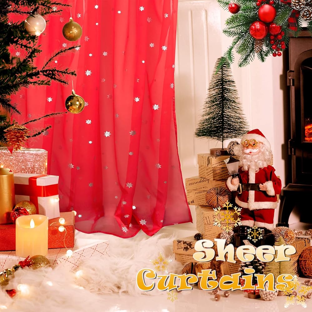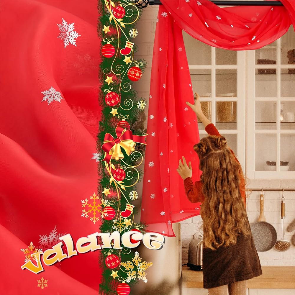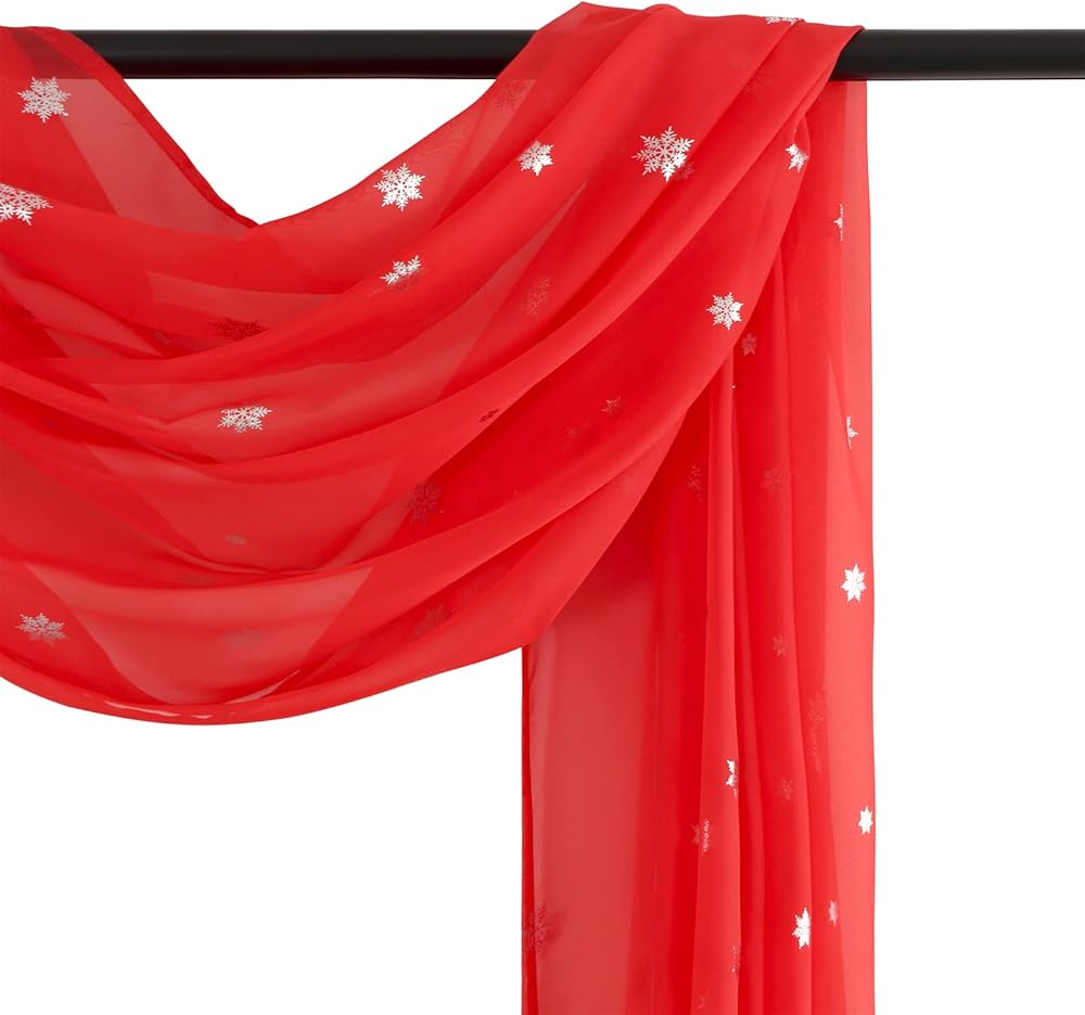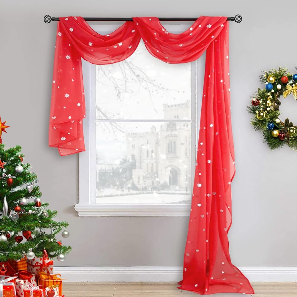 bgment الأحمر عيد الميلاد وشاح الستائر لغرفة المعيشة 144 بوصة طول، نافذة شفافة وشاح الستارة زينة عيد الميلاد في الأماكن المغلقة مع طباعة الفضة الثلوج، 1 لوحة، كل لوحة 52 بوصة واسعة