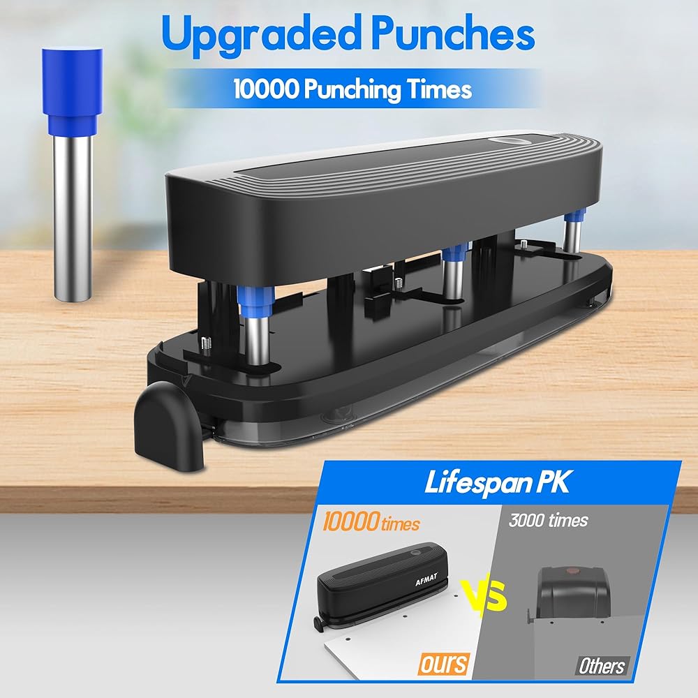 【10000 Punching Times】 This heavy duty electric 3 hole punch has a mighty electric motor, sharp puncher heads, and reinforced construction, so it's gonna work like a hot knife through butter, and leave beautiful clean cuts every single time. Very well made to last: up to 10000 punching times. This electric 3-hole punch is definitely a workhorse for any office, home, or classroom setting calling for reliability even under heavy use.