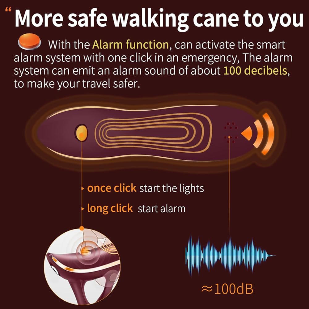 🥇【إنذار ذكي بنقرة واحدة】يمكن للعصا للنساء والرجال تفعيل نظام الإنذار الذكي بنقرة واحدة في حالات الطوارئ، مما يساعد كبار السن على طلب المساعدة من الآخرين في الوقت المناسب. يمكن لنظام الإنذار أن يصدر صوت إنذار يبلغ حوالي 100 ديسيبل، والذي يمكن سماعه بوضوح على بعد 100 متر.