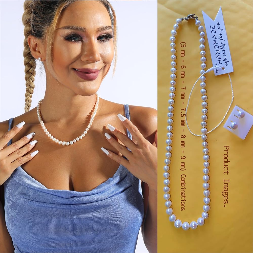 • 【قلادة لؤلؤية】: مجموعة عقد لؤلؤ كلاسيكي غير دائري، 17 بوصة، 19 بوصة، 21 بوصة (5 مم - 6 مم - 7 مم - 8 مم - 9 مم مجمعة حسب الحجم) مع أقراط لؤلؤ 7 مم. كلاهما أنيق وكلاسيكي