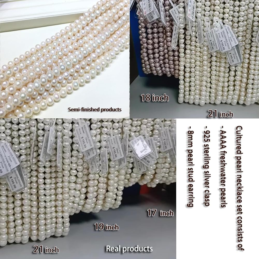 مجموعة قلادات لؤلؤ المياه العذبة - أقراط لؤلؤ من الفضة الإسترلينية هي مجموعة مجوهرات نسائية مصنوعة من مزيج من اللؤلؤ بدرجة AAAA (19 بوصة، أبيض حليبي)