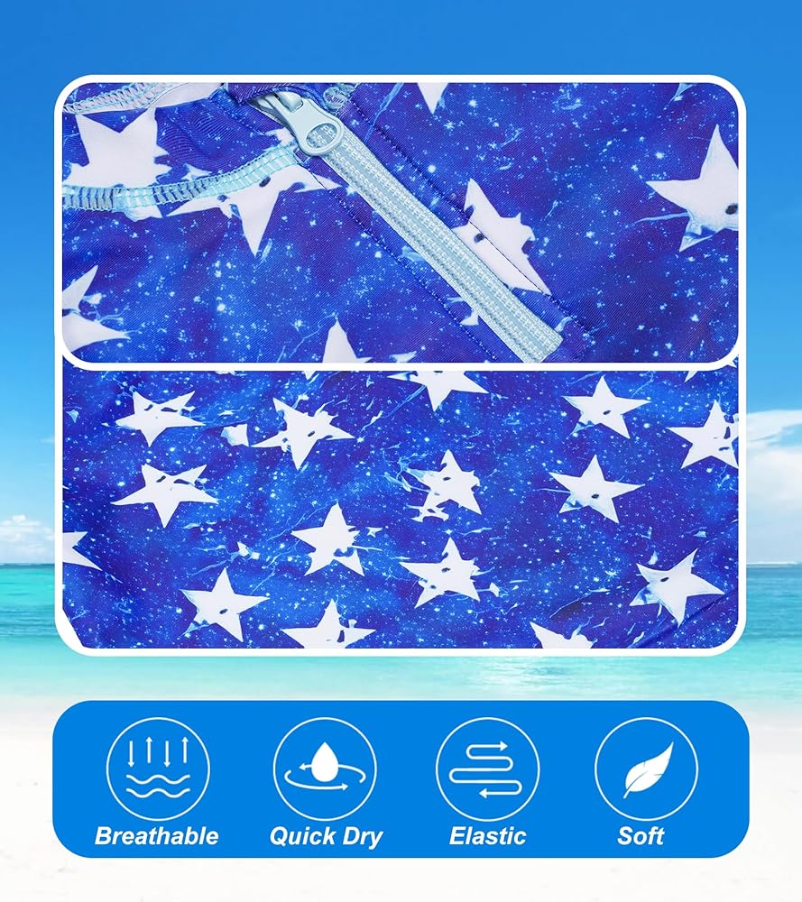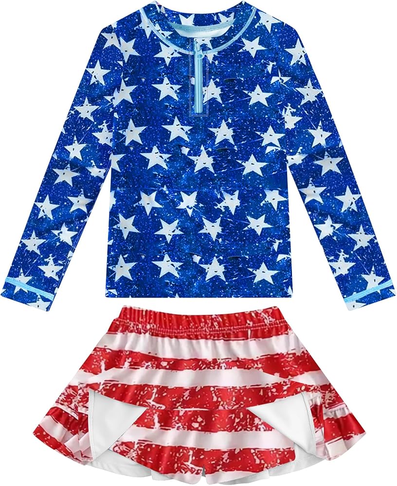 - COMPOSITION: Two-Piece Girls Swimsuit Set, Include Long Sleeved Shirt with Zipper, Bottom Shorts with Ruffled Skirt.