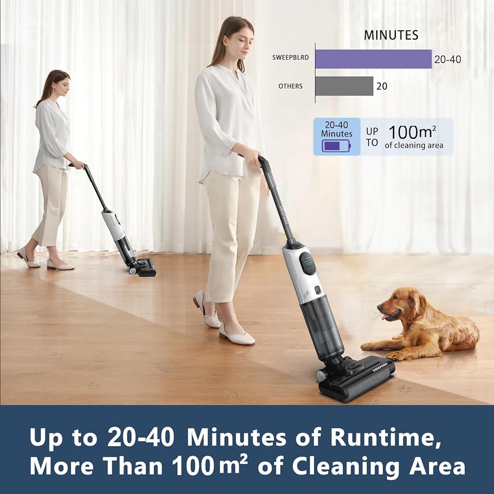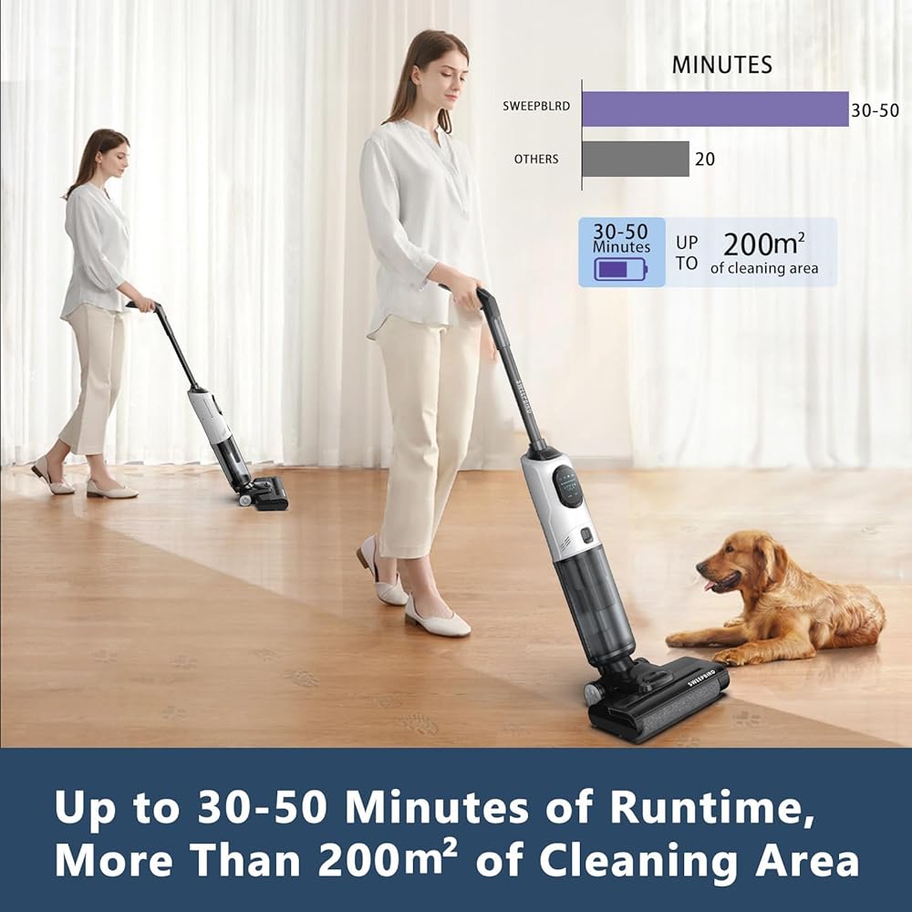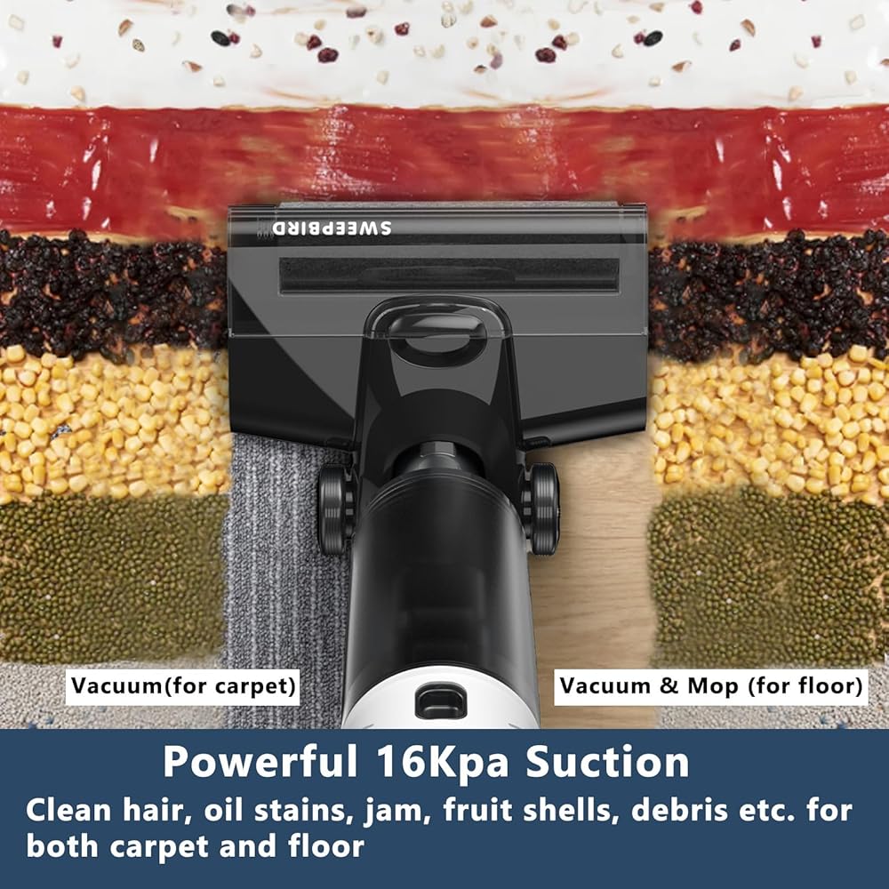 【شفط أقوى ووقت تشغيل أطول】تتميز ماكينة تنظيف الأرضيات بمستوى شفط أكثر من 20 ألف باسكال مع ضوضاء أقل، وتنظيف شعر الحيوانات بسهولة، والبقع الزيتية، والنفايات الصلبة والسائلة؛ يمكن أن تدوم البطارية لمدة 30-50 دقيقة ويمكن تنظيفها بسهولة على مساحة 200 متر مربع.