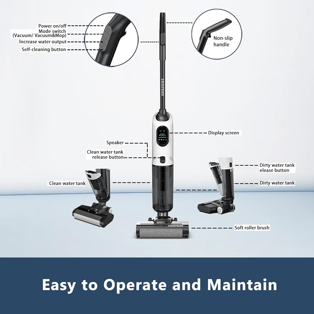 [تنظيف قطعة واحدة] لا مزيد من المتاعب من قضاء الكثير من الوقت في تنظيف الأرضيات، ستقلل آلة تنظيف الأرضيات وقت التنظيف الخاص بك عن طريق مكنسة كهربائية 3 في 1 وممسحة وغسل في نفس الوقت. توفر ماكينة الأرضيات النظيفة لدينا تنظيفًا ذاتيًا بلمسة واحدة لسهولة الصيانة، وتنظيفًا أوتوماتيكيًا بالكامل لأسطوانة الفرشاة والأنابيب للصيانة بدون استخدام اليدين.
