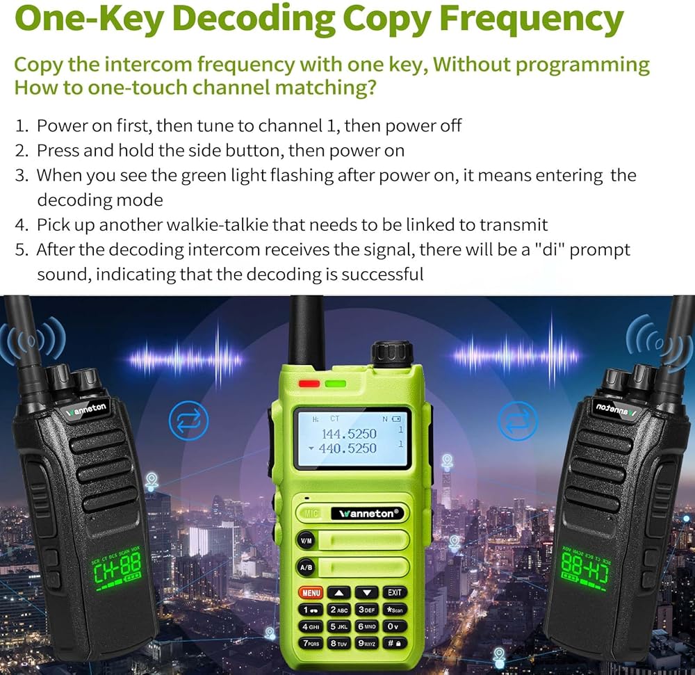 تردد نسخ فك التشفير بمفتاح واحد: يمكنك فك تشفير تردد الإرسال ورمز الخصوصية لأجهزة الاتصال اللاسلكي الأخرى ذات التردد U باستخدام مفتاح واحد وتعديلها تلقائيًا لتتوافق مع التردد ورمز الخصوصية لأجهزة الاتصال اللاسلكي الأخرى، حتى تتمكن من التحدث مباشرة. يحل معظم مشاكل الرغبة في التحدث مع ماركات أخرى من أجهزة الاتصال اللاسلكي دون معرفة التردد وكود الخصوصية للماركات الأخرى، وبدون برامج برمجة الكمبيوتر
