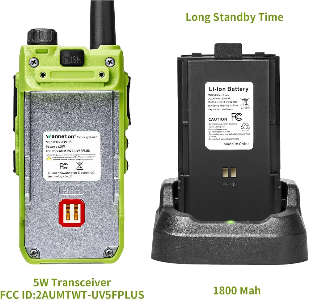 خياران للشحن: يتميز راديو Wanneton ham بواجهة شحن USB من النوع C، مما يسمح لك بشحن أجهزة الراديو ثنائية الاتجاه باستخدام بنك الطاقة أو الكمبيوتر أو شاحن السيارة لتوفير الراحة أثناء رحلاتك. وبدلاً من ذلك، يمكنك استخدام قاعدة الشحن لشحن جهاز الاتصال اللاسلكي أو البطاريات الفردية. هذا الراديو معتمد بالفعل من قبل لجنة الاتصالات الفيدرالية، بمعرف لجنة الاتصالات الفيدرالية: 2AUMTWT-UV5FPLUS