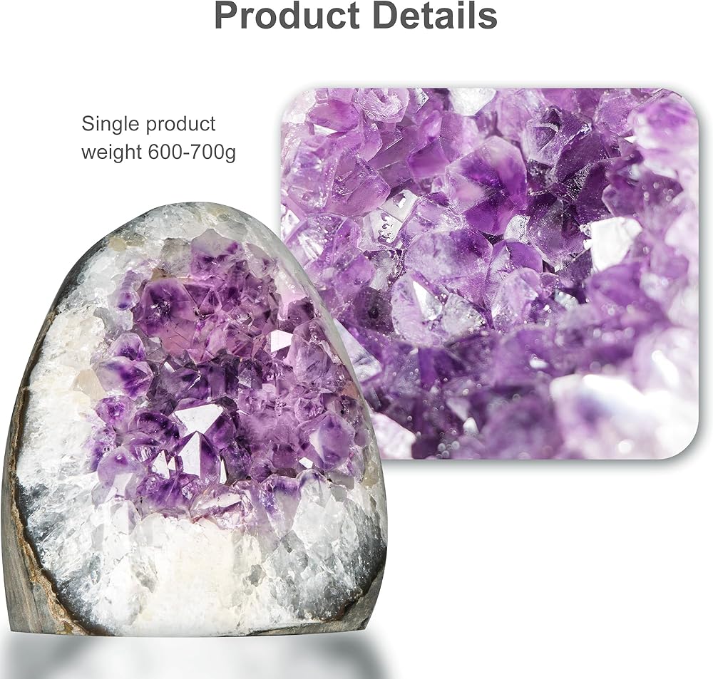 الحجم والوزن: يبلغ ارتفاع الجمشت حوالي 3-5 بوصات ووزنه حوالي 1.3-1.54 رطل. ستكون كل قطعة مختلفة في الحجم، وشكل غير منتظم ولها جمال فريد.