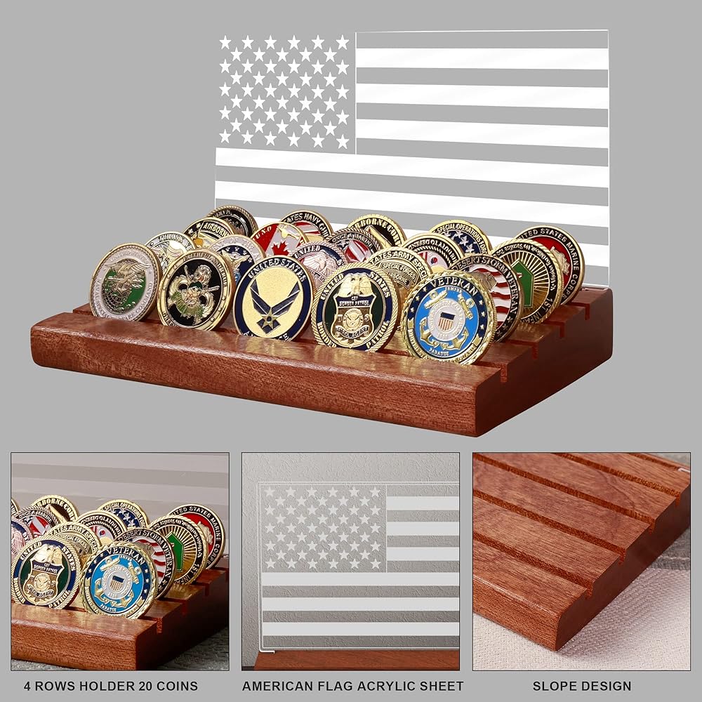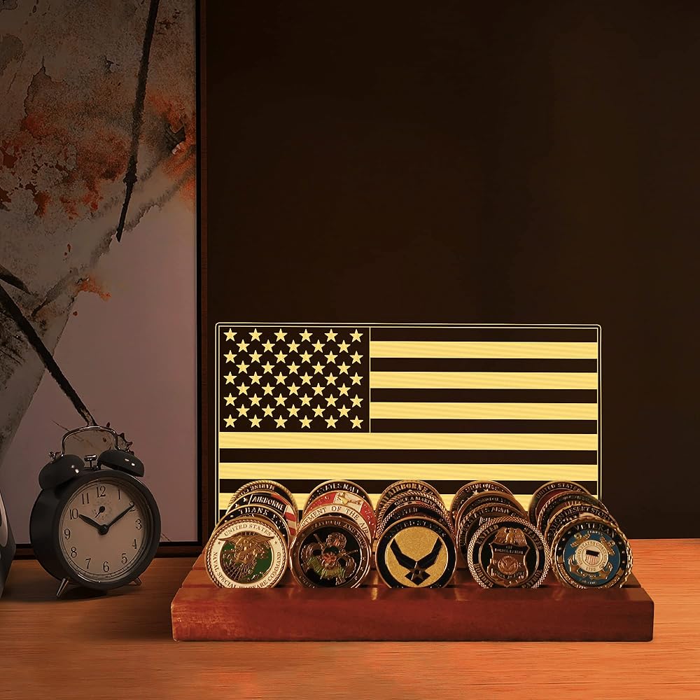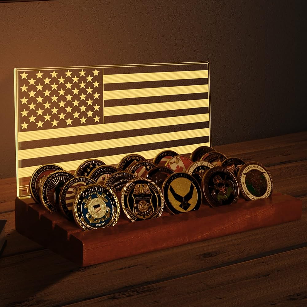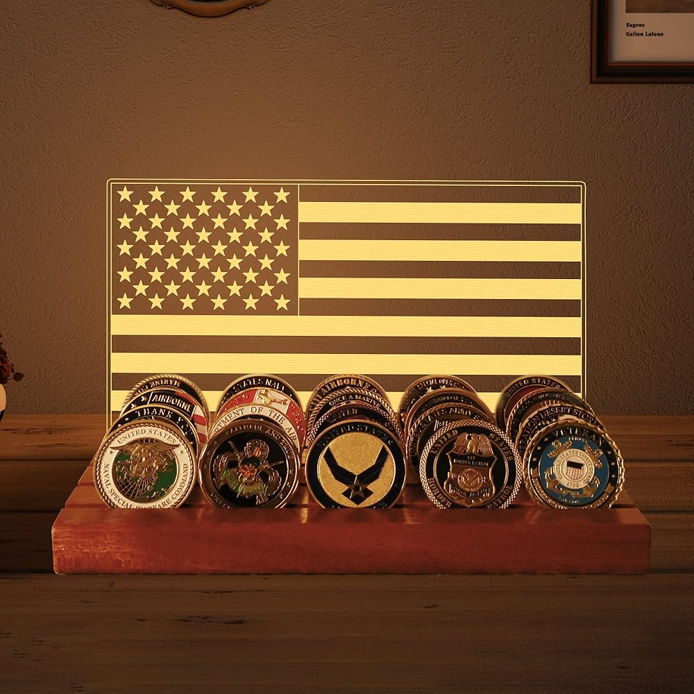 عرض عملة التحدي المضيئة من الأمونيت، حامل عملات العلم الأمريكي مع لون أبيض دافئ من الخشب الصلب الخفيف 4 صفوف حامل خشبي هدية عملات تحدي الوقوف للجيش العسكري له الأب