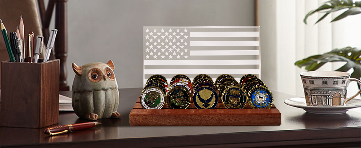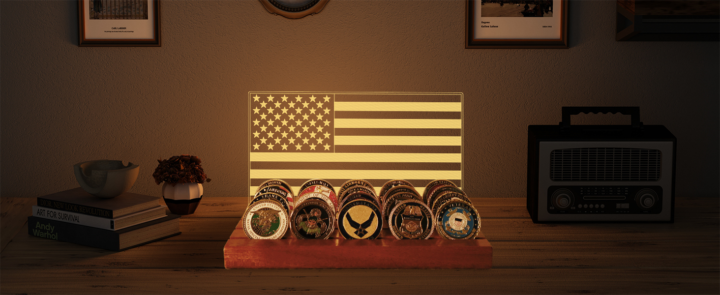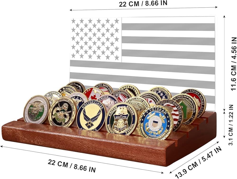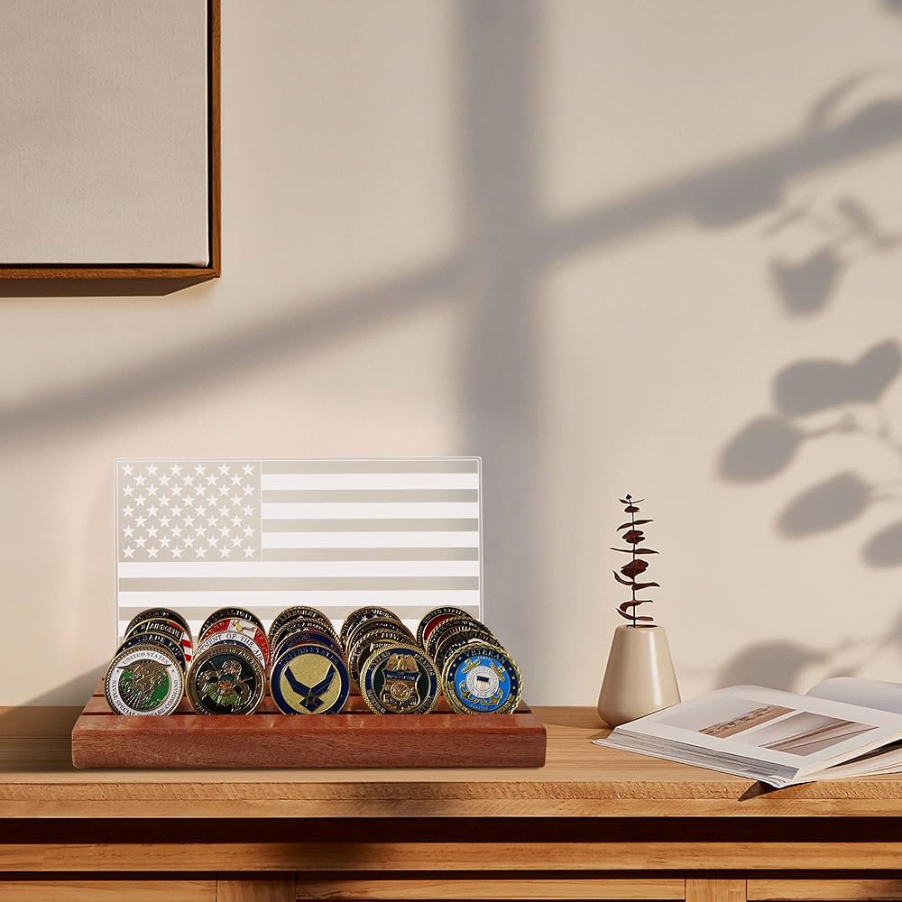 عرض عملة التحدي المضيئة من الأمونيت، حامل عملات العلم الأمريكي مع لون أبيض دافئ من الخشب الصلب الخفيف 4 صفوف حامل خشبي هدية عملات تحدي الوقوف للجيش العسكري له الأب