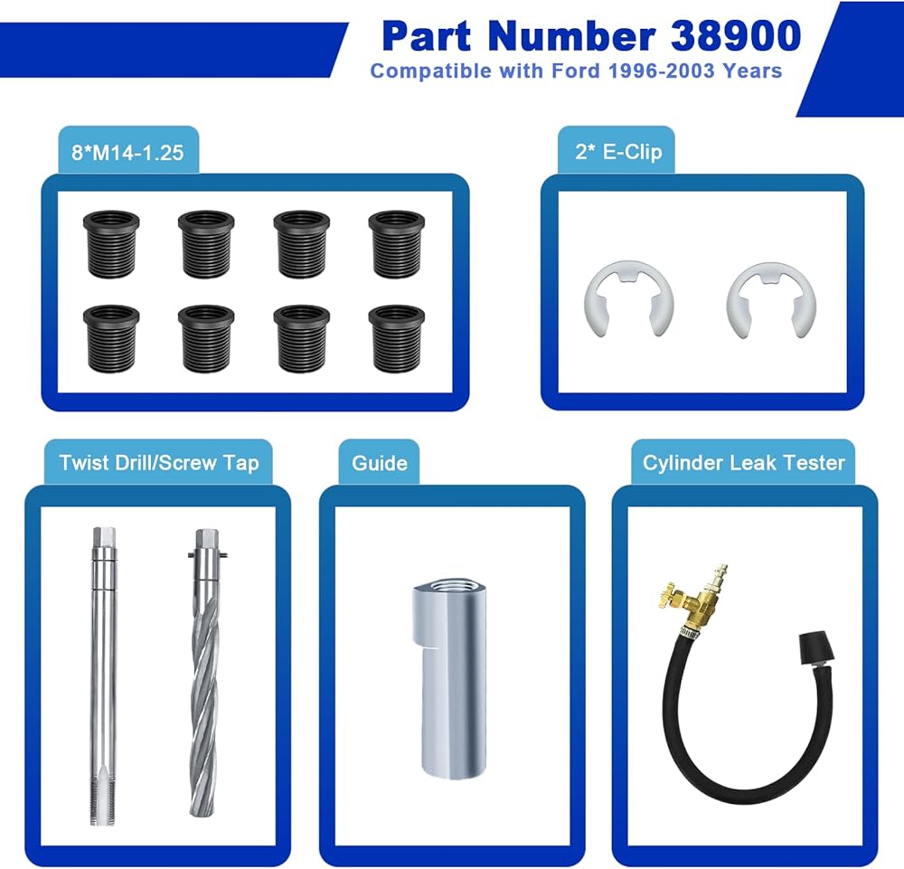متوافق مع سنوات الطراز 1996-2003: مجموعة إصلاح الخيوط هذه مناسبة لمحركات ذات صمامين 4.6 لتر و5.4 لتر و6.8 فولت-10. للاستخدام في السنوات من 1996 إلى 2003، الجزء رقم 389100 استبدال مع إدراجات. يرجى التحقق من وقت إنتاج محرك سيارتك ورقم الطراز قبل الشراء. استخدم نطاق التجويف للتأكد من أن المكبس منخفض بمقدار 2 إلى 4 بوصات على الأقل قبل التشغيل. وهذا يمنع نشارة الخشب من الانتشار في جميع أنحاء المحرك ويمنع المثقاب من إتلاف المكبس!