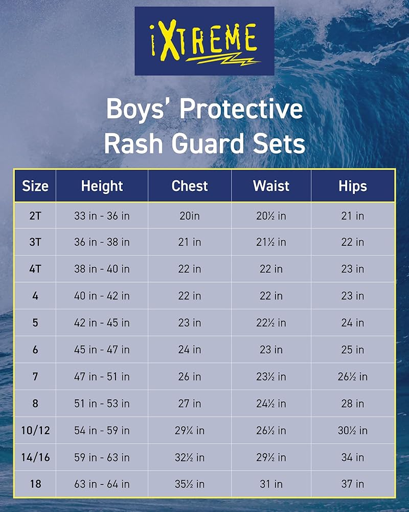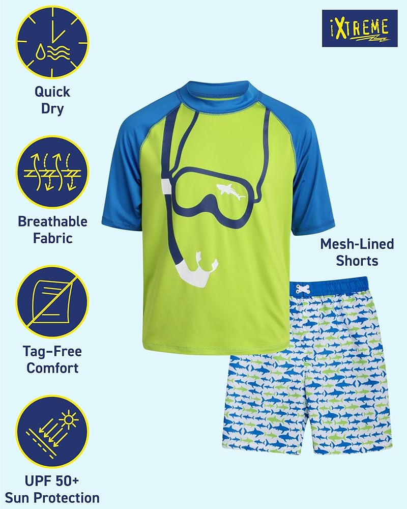 iXtreme Boys' Rash Guard Set - 2 Piece UPF 50+ Quick Dry Swim Trunks and Shirt is the perfect choice for a summer full of fun splashing in the pool and hanging out at the beach. Choose from several designs for a summer filled with memories! Your little guy will love wearing these beach shorts and the comfortable, matching short-sleeve swim shirt. SWIM TRUNK SHORTS: Our boys' swim trunks are designed with an elastic waistband for a perfect fit and feature fun patterns and bright colors for a cool, playful look stamped with the classic iXtreme logo. SOFT AND COMFORTABLE mesh swimming trunks for boys. Lightweight and comfortable, these summer trunks are perfect for a fun beach day and all water sports. ADORABLE DESIGN: Your beach bum will be the center of attention with our rash guard set! Choose from a wide variety of designs including vibrant colors and themes. PERFECT FOR VACATION: You will love to share all your vacation photos of your kids splashing around in the sun with this cute swimsuit set, featuring a pair of bright swim trunks and a short-sleeve swim shirt. HIGH QUALITY: Superior UPF 50+ protective fabric and construction of this boys' short-sleeve rashguard shirt will hold up to a summer full of chlorine, sand, and washing, and will look bright all season long. EASY CARE: Simply machine wash and tumble dry; Please Reference the Variations for all Available Sizes and Colors. iXtreme Offers Premium Clothing because we value every customer that visits our listings! Stop by Our Storefront to See the Rest of Our Great Deals; we're confident you're going to find items that anyone who needs a gift will absolutely love and adore!