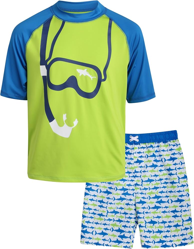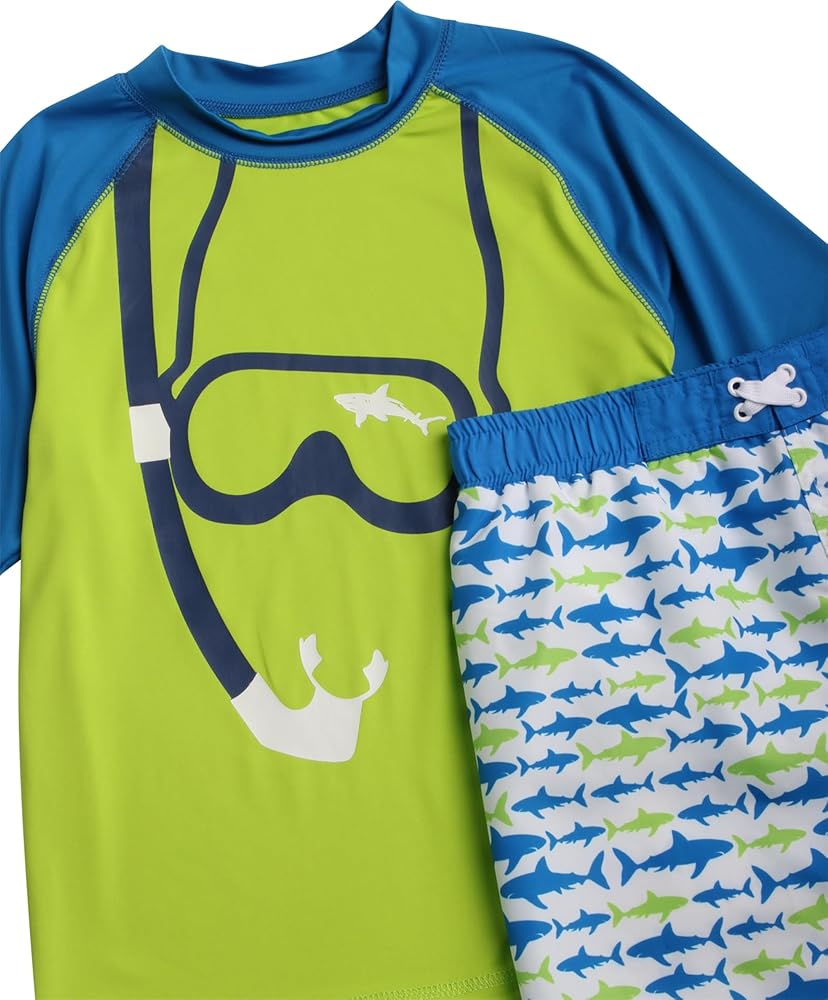 GREAT VALUE: Our rashguard set featuring a short-sleeve t-shirt and matching swim trunks provides the ultimate sun cover protection for your child; Our fashionable bathing suit ensures a great summer look; This high-quality rashguard set is also perfect as a gift; Get our colorful swimsuit set for your son, grandson, nephew, little brother, cousin, or friend
