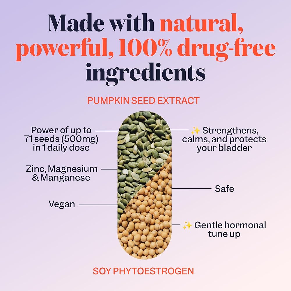 تحسين تعافي قاع الحوض - يساعد على إصلاح عضلات قاع الحوض، على غرار تمارين كيجل، مع تعزيز تدفق البول والتحكم فيه. يعزز الاستروجين النباتي من الصويا إنتاج الكولاجين ويبني قوة العضلات، مما يفيد الأمهات بعد الولادة والنساء بعد انقطاع الطمث. بالإضافة إلى ذلك، يعمل مستخلص جنين الصويا على استرخاء المثانة، كما يدعم مستخلص بذور اليقطين عضلات قاع الحوض، مما يعزز الأحاسيس "الطبيعية".