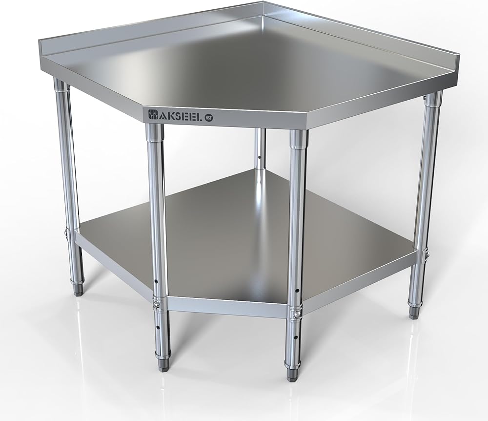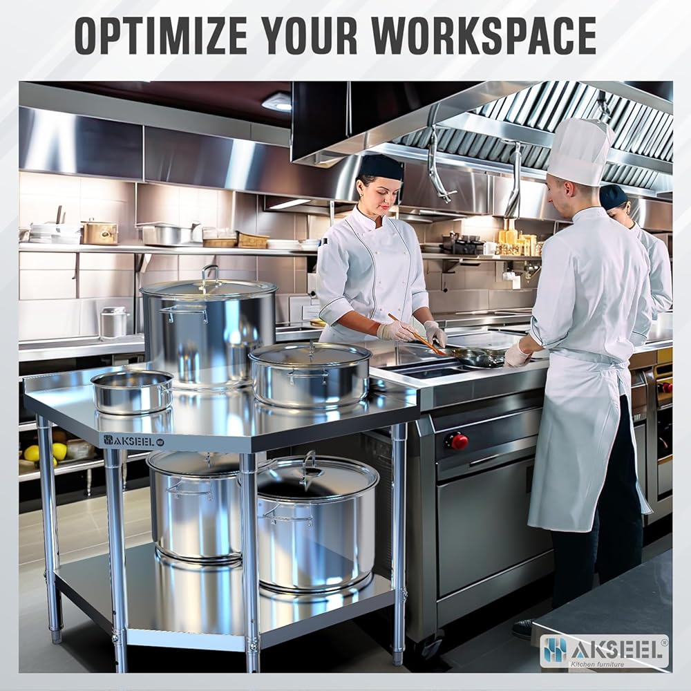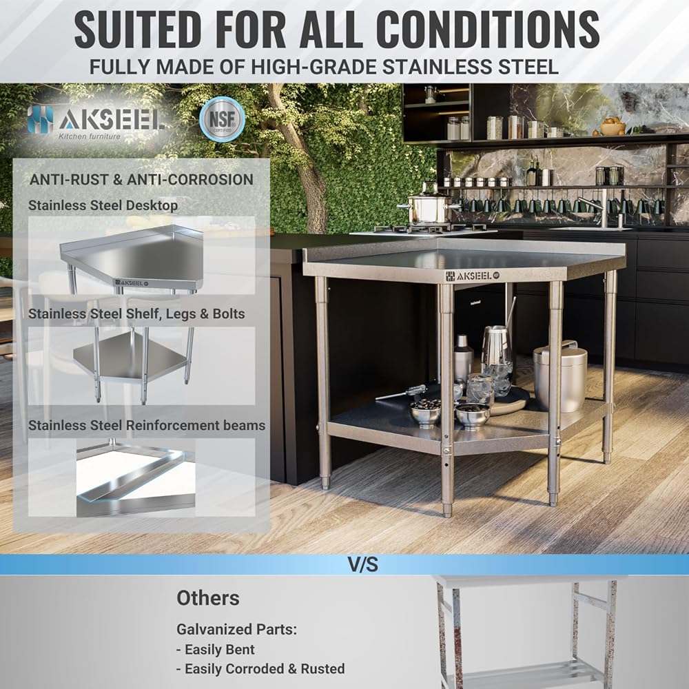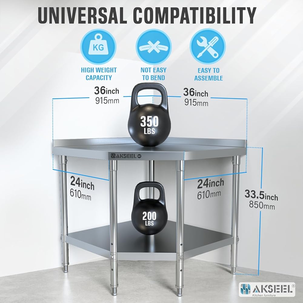 【Designed for Efficient Kitchen Use】Our stainless steel corner work table with undershelf is uniquely crafted to fit seamlessly into kitchen angles and corners, optimizing your workspace for food preparation and organization.