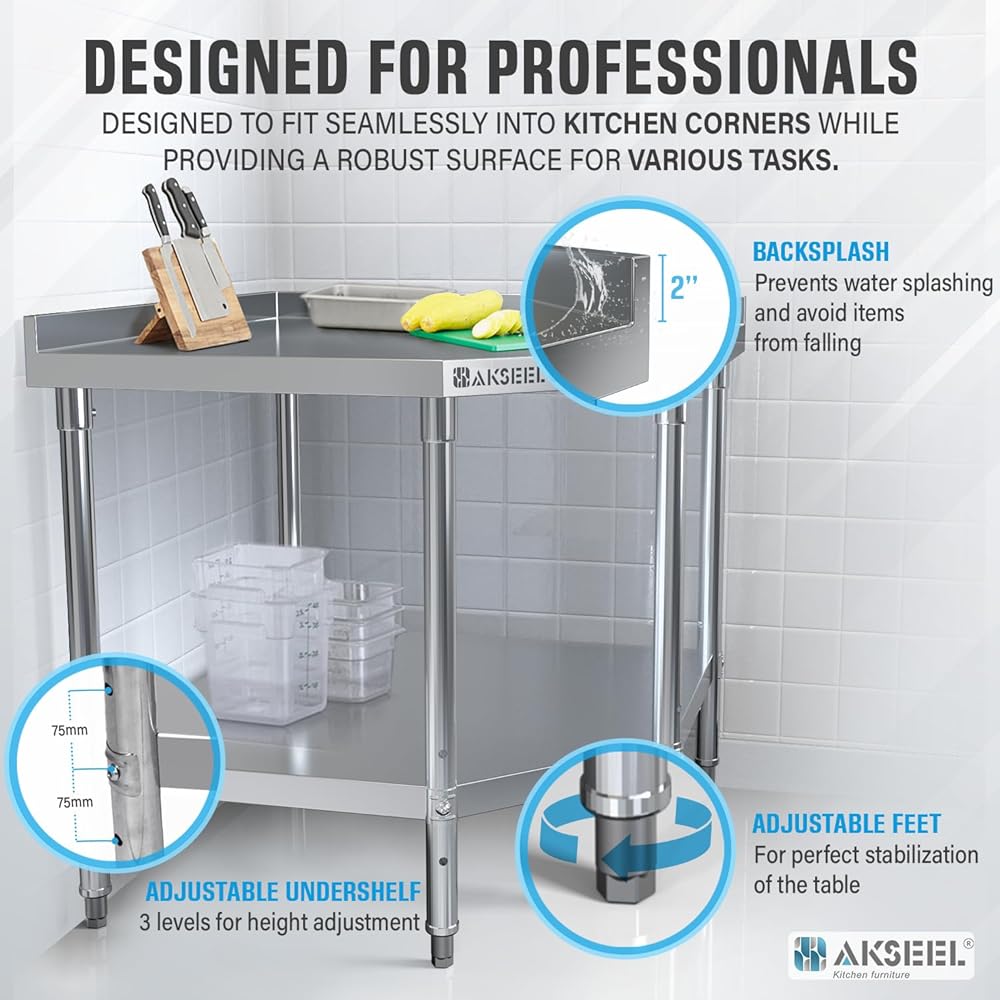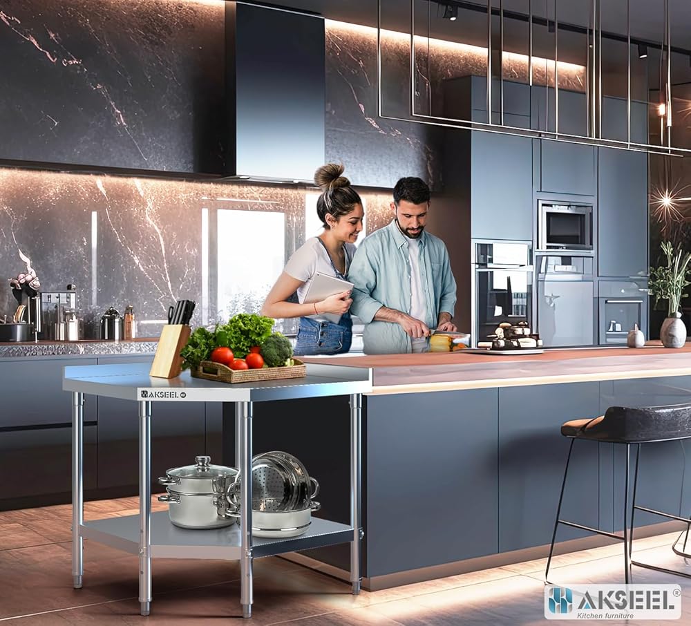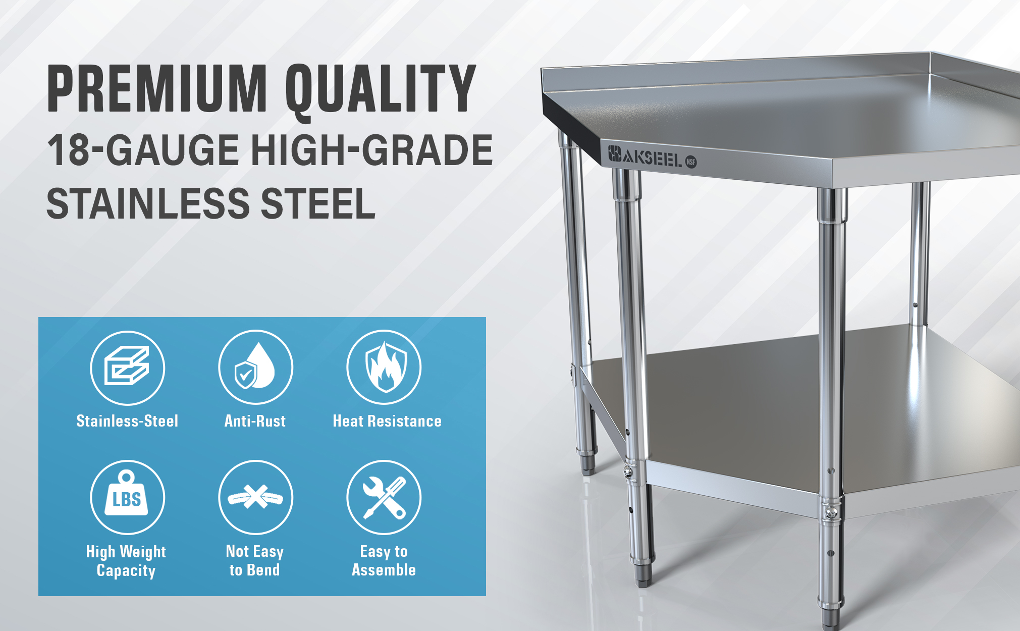 【Designed for Efficient Kitchen Use】Our stainless steel corner work table with undershelf is uniquely crafted to fit seamlessly into kitchen angles and corners, optimizing your workspace for food preparation and organization.