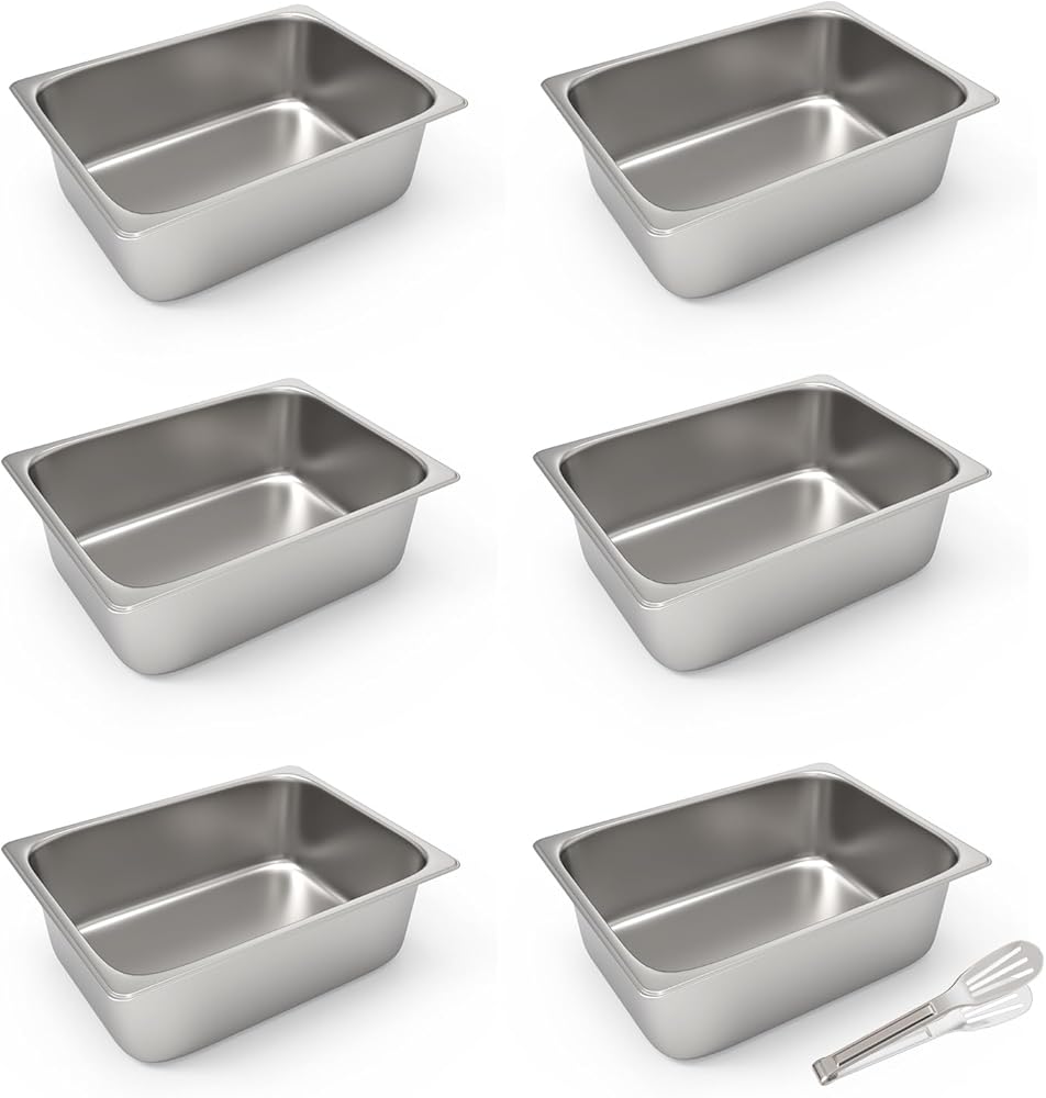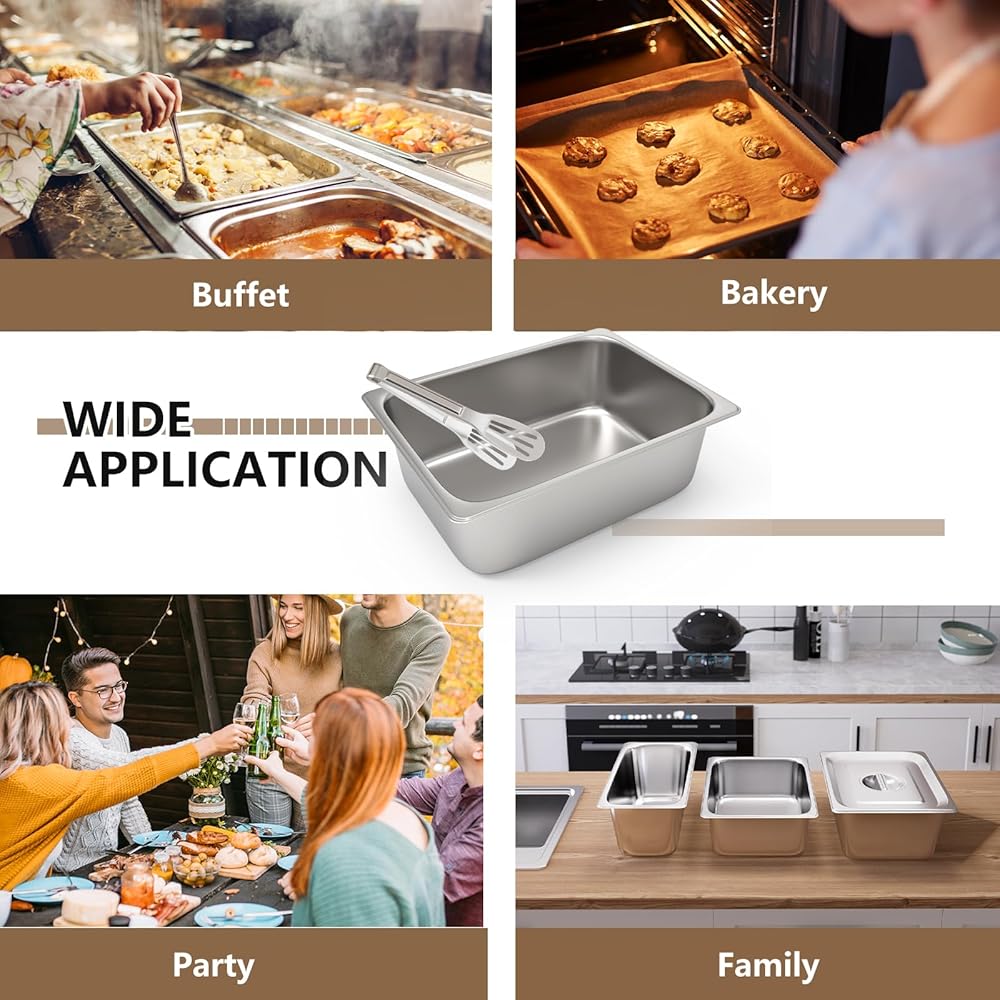 【Superior Heating Performance】—The stainless steel steam pan can withstand high temperatures without warping or melting. This makes it suitable for serving hot or cold dishes alike, providing versatility in various meal settings; Our stainless steel containers are compatible with various kitchen appliances, including stovetops, steam table, and chafing dishes. The stackable design allows for efficient storage, saving valuable space in your kitchen.