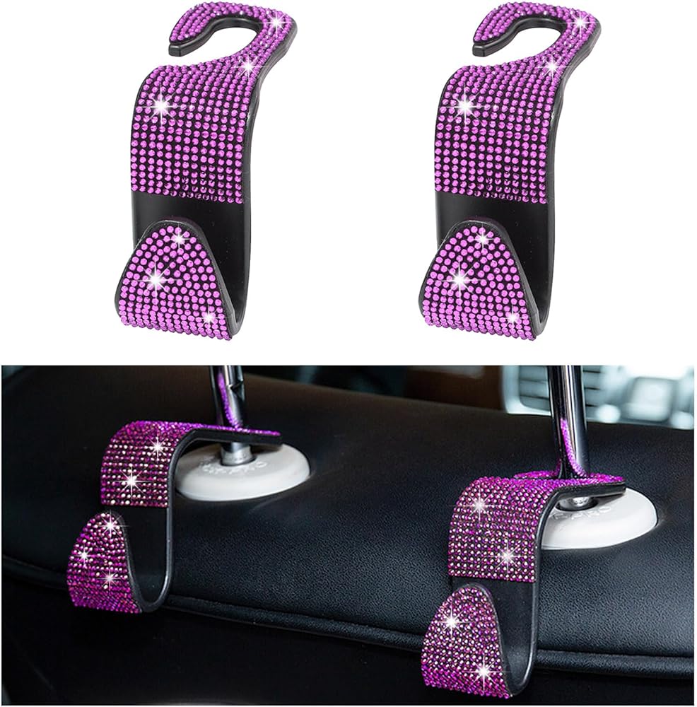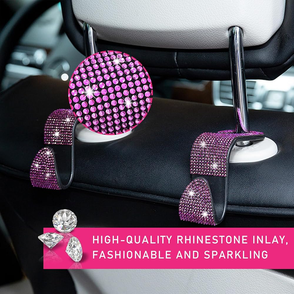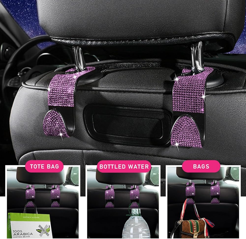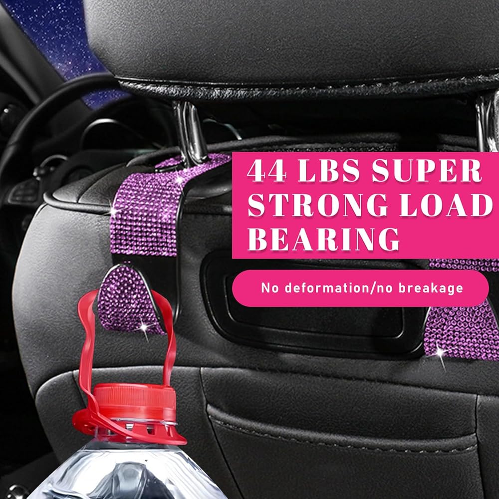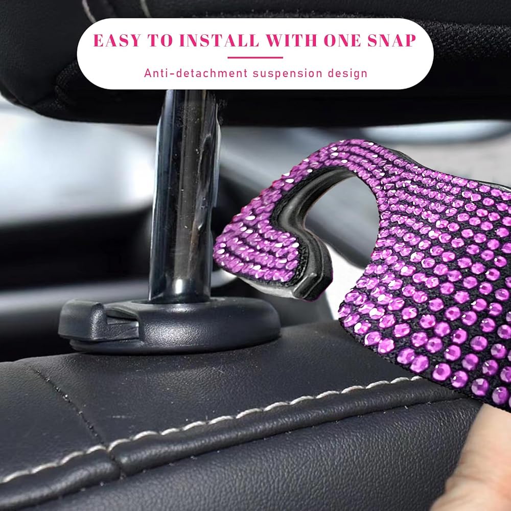 【Premium Material】: The car back seat headrest hook is made of premium ABS plastic and lots of rhinestones. The ABS material is quite sturdy and durable, can hold up to 20 kilograms. So, you don't need to worry about the product breaking easily. The rhinestones are upgraded with strong adhesive force, don't fall off easily.