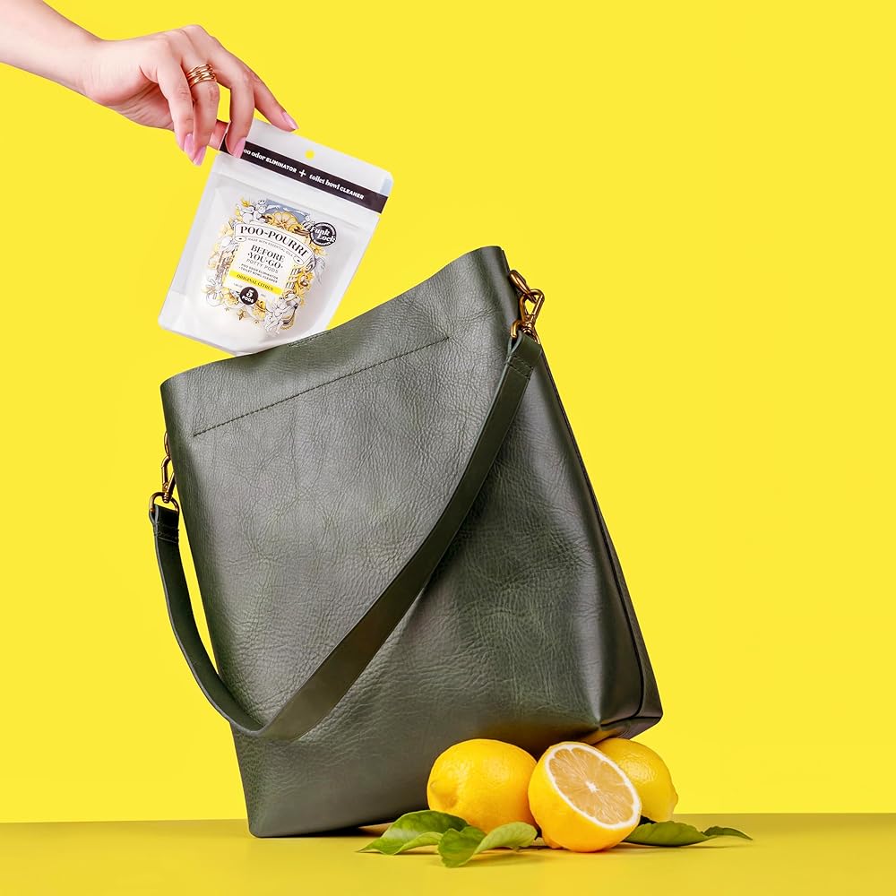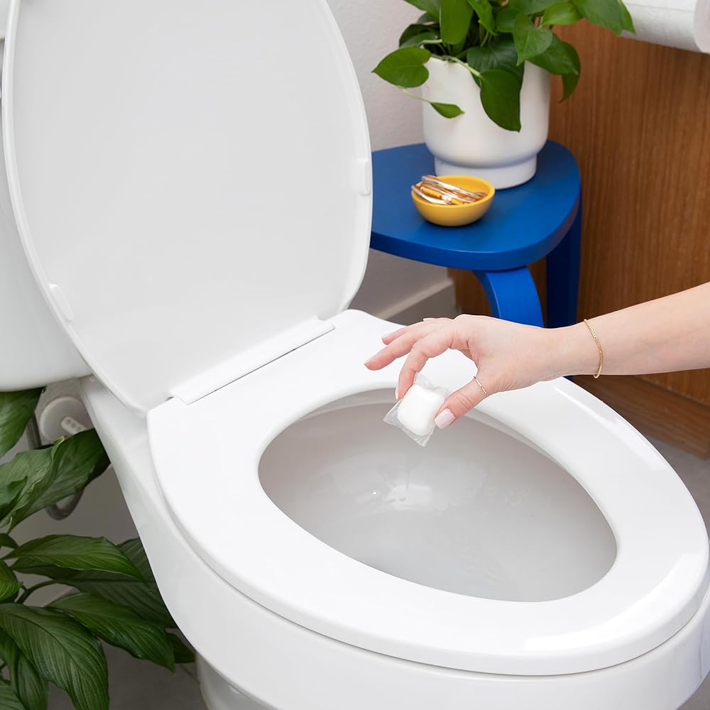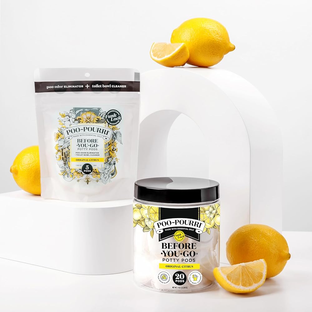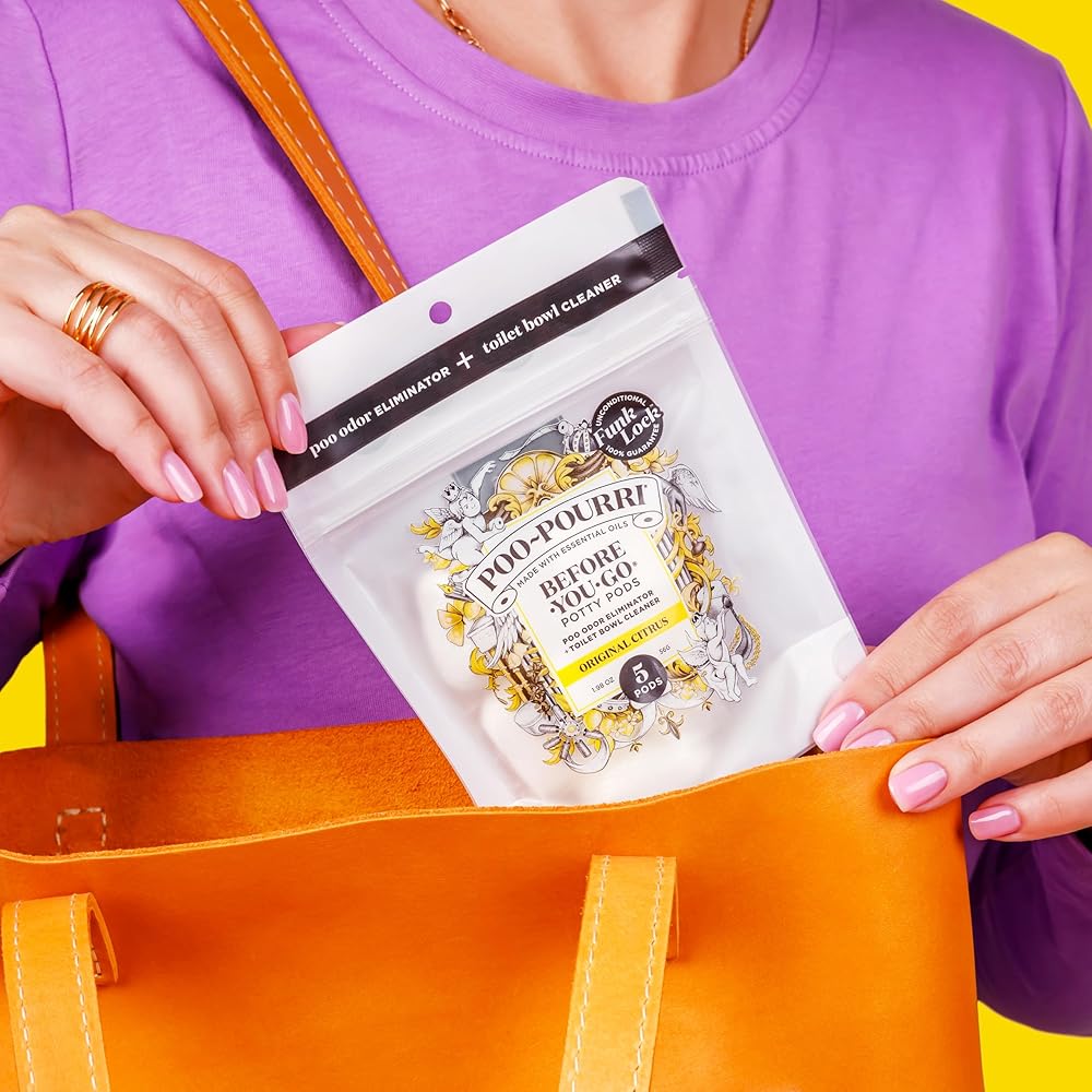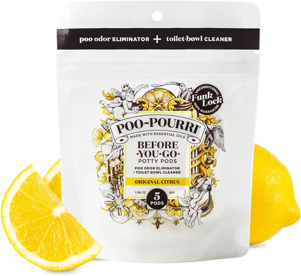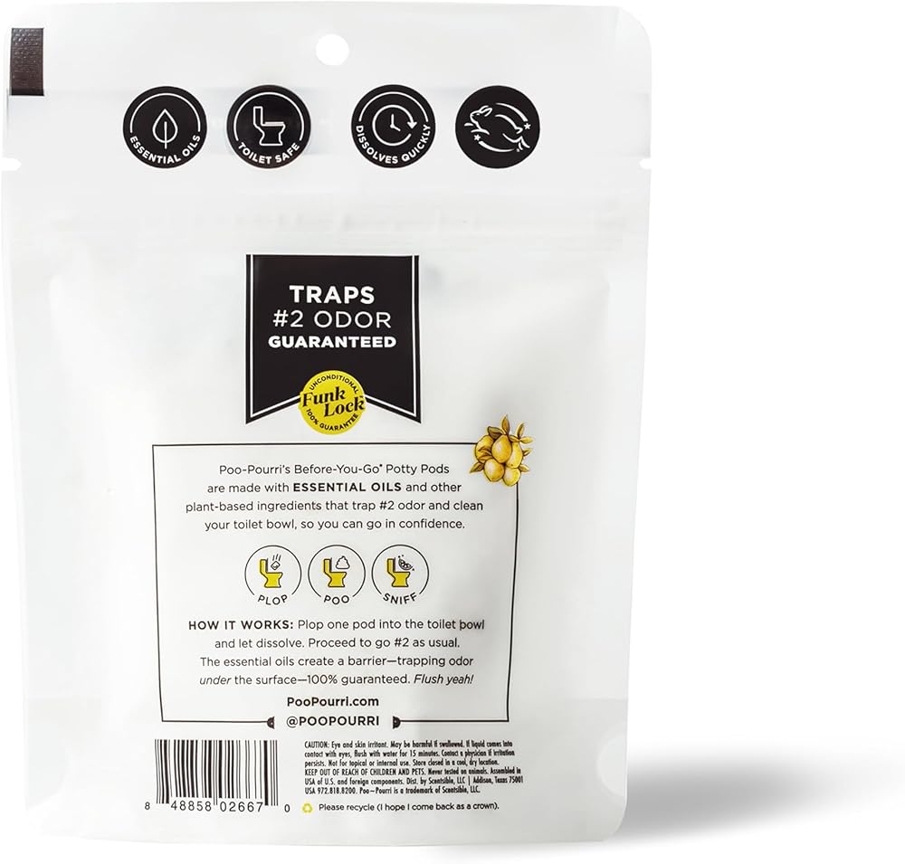 There is a universal anxiety associated with going number two and leaving the bathroom smelling awful—especially in a shared bathroom. Poo-Pourri is the original Before-You-Go Potty Pods that leaves any bathroom smelling better than you found it—guaranteed! Its proprietary blend of essential oils and plant-based ingredients is formulated to trap odor under the toilet water's surface, eliminating odor—before it ever begins! 2 IN 1 AIR FRESHENER + TOILET BOWL CLEANER. No spray, no spill – dissolves instantly when dropped into the toilet bowl and creates a barrier on the surface of the water. Septic safe and toilet friendly.