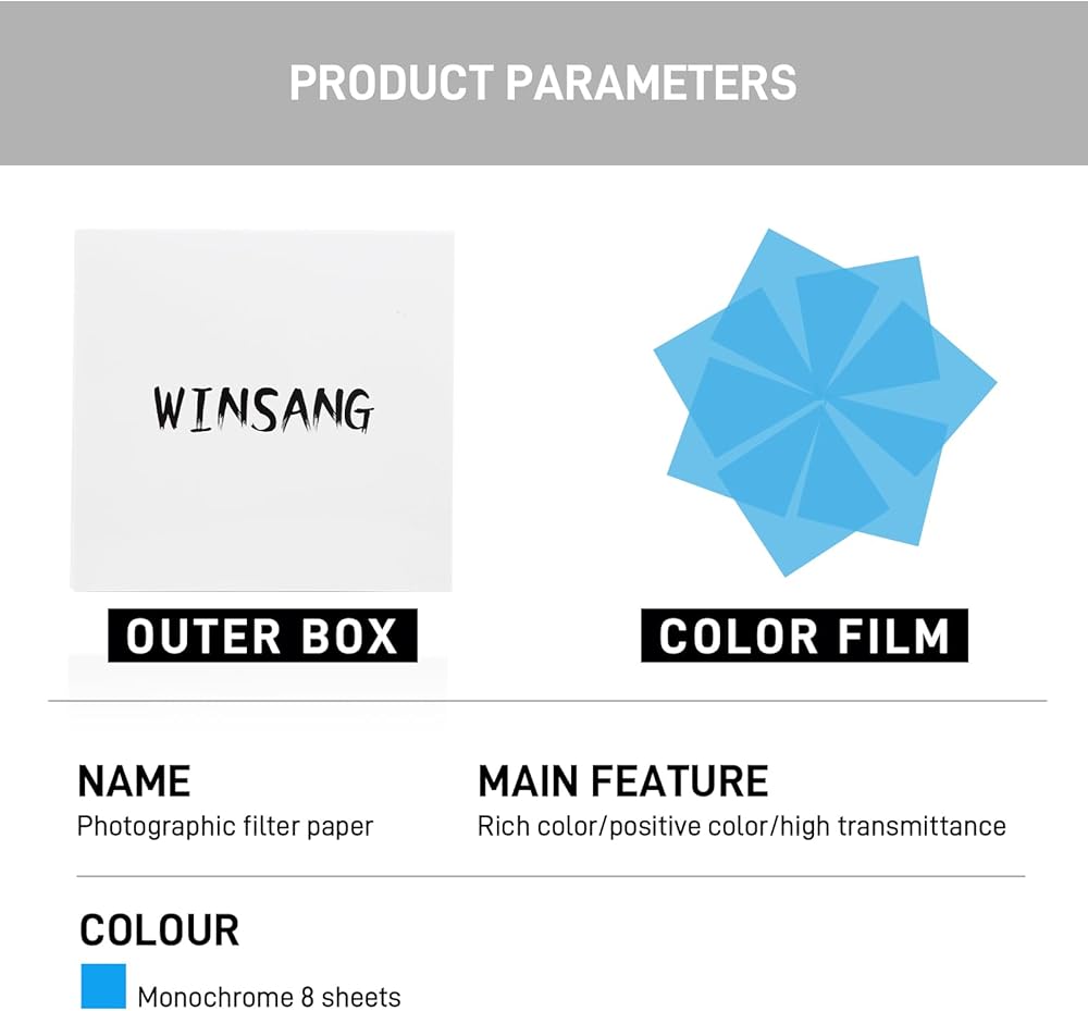 This is a Color Correction Gel Light Filter.Functions: *Used for lighting effects and color correction, involving additive and subtractive color, color mixing, color transmission, absorption and filtering of the different wavelengths of light *Used in film, video, photo, stage, theater, party, and DJ lighting.* Colors: Trans-Light Blue.*Spirit Level only, other accessories demo in the picture is not included! Feature:*IMaterial: Made of high light transmission material with light weight steady color temperture and low loss.Durable. Size: Approx. 20x20cm/7.8x7.8'' *Color: Trans-Light Blue*Packing including: 8 * Gel light filters (one color for 8 pieces)Note:*1.Please allow 1-3cm error due to manual measurement. pls make sure you do not mind before you bid.*2.Due to the difference between different monitors, the picture may not reflect the actual color of the item.*3.Keep away from Fire!*4.Be careful of cut hands. Not suitable for child under 3 years old!5.Please don't attach the gel filter to modeling lamp or it will be melted.Thank you! *Package Included: 8 x Flash Color Gels Packing SafelyIn plastic bag in boxesFor more choice for Photographic equipment accessories , Welcome to Winsang Store