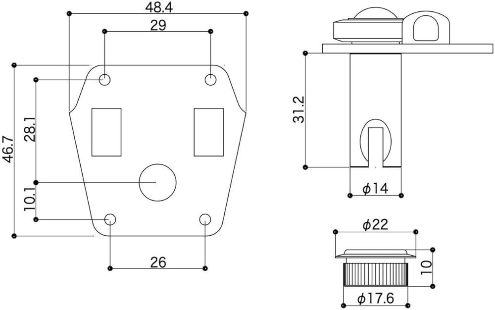 • Mounting hole spacing is 1-9/64" across the top, 1-1/32" across the bottom, and 1-31/64" top to bottom (on center)