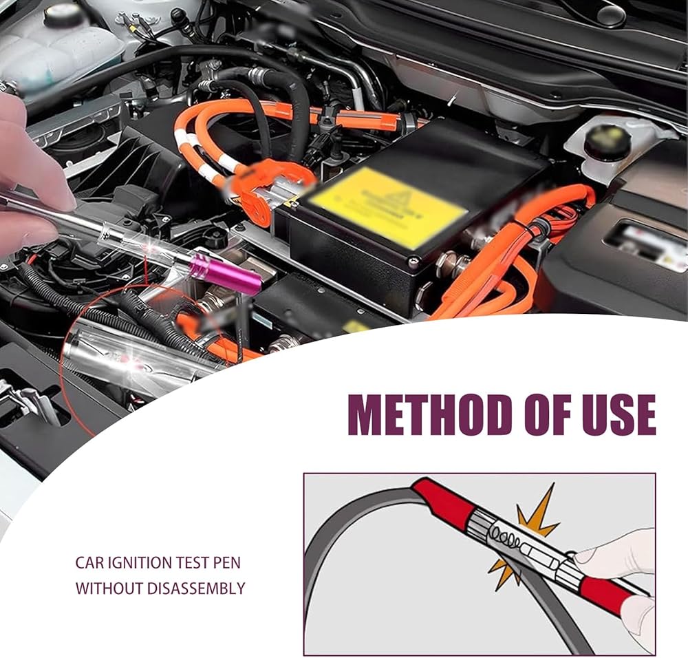 Function: This spark plug tester can be used for spark plug testing, high-voltage line testing, and ignition coil testing. You can directly judge whether the spark plug is working properly from the light indication of the test pen. Test spark plugs, spark plug wires and coils without piercing the wires.