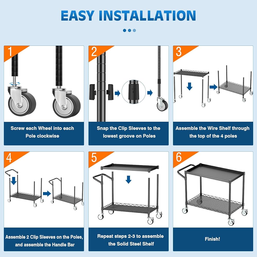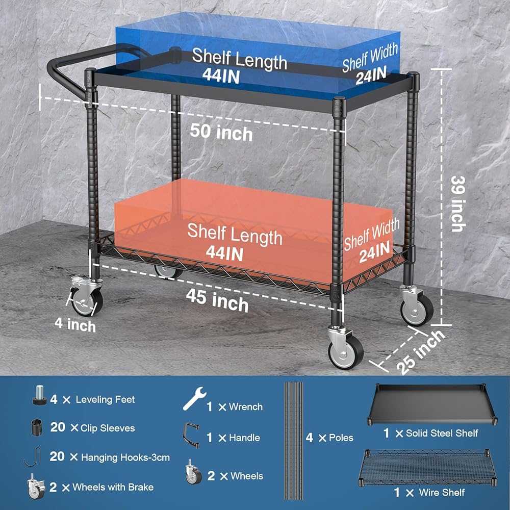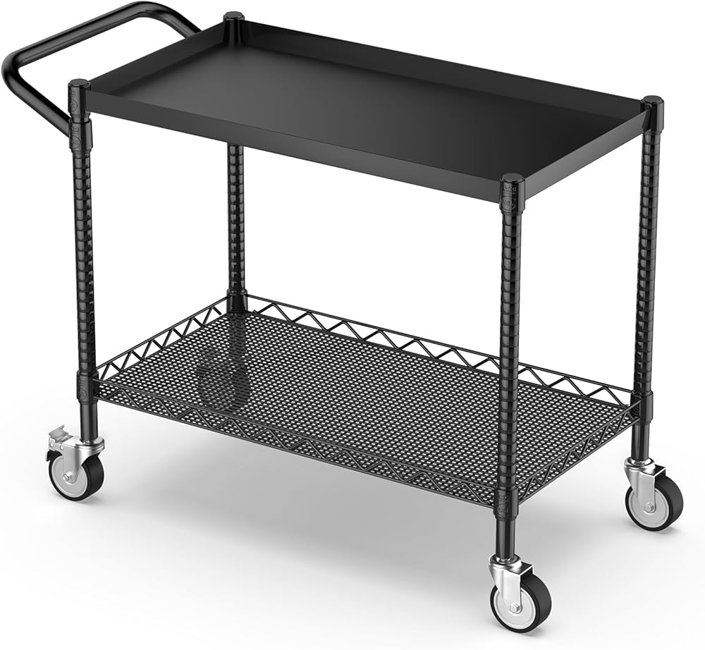 عربة أدوات ذات طبقتين مع عجلات، معتمدة من NSF بسعة 900 رطل، عربات أدوات دوارة شديدة التحمل مع شريط مقبض، عربة تخزين معدنية تجارية من الدرجة التجارية لمطبخ مرآب المستودعات، أسود