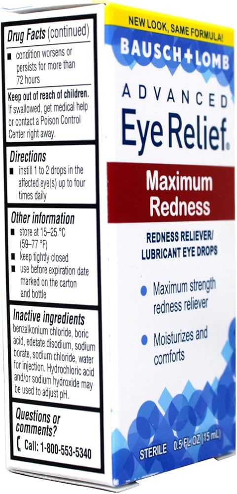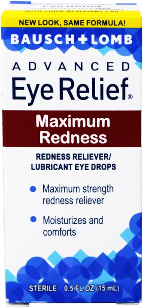 Bausch + Lomb Advanced Eye Relief Maximum Redness - Redness Reliever/Lubricant Eye Drops contain a maximum strength redness reliever to help moisturize and comfort red, irritated eyes. These drops provide temporary relief of redness and discomfort due to minor eye irritations, exposure to wind or sun and dryness of the eye and prevent further irritation. Advanced Eye Relief Maximum Redness eye drops contain 0.03% naphazoline hydrochloride, the maximum amount of the redness reliever allowed for over the counter use.