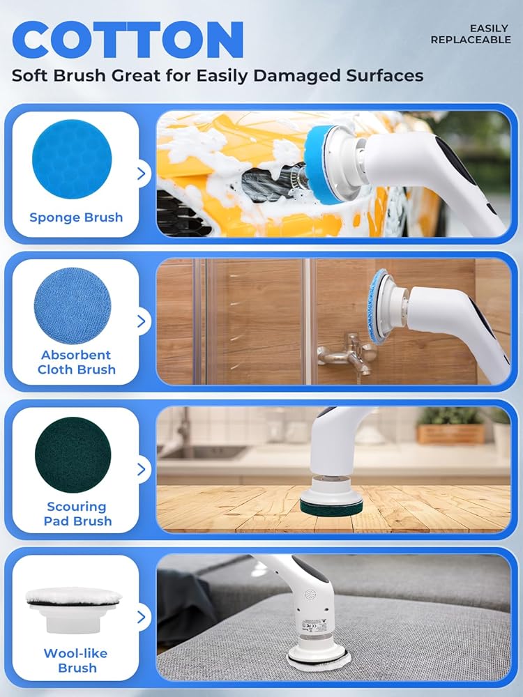 【9 Replaceable Versatile Brush Heads】This electric spin scrubber comes with 9 interchangeable heads for every cleaning need: flat and round for floors, walls, and baths; a corner brush for tight spaces; cloth and sponge for windows and leather. Ideal for polishing and waxing cars too.