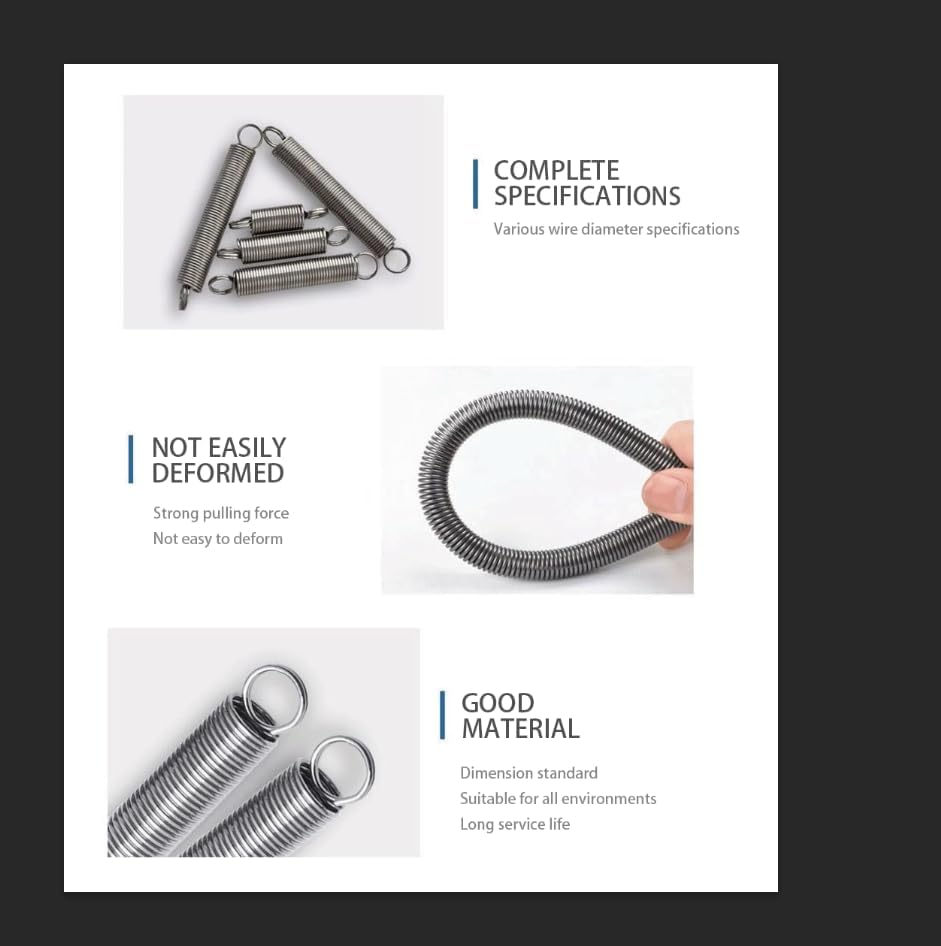 • Stretch spring: 11 kinds of stretch spring, professionally designed to stretch from the middle of the spring, stronger than the spring stretched from the edge, more uniform force, longer fatigue resistance, longer service life, make your products durable