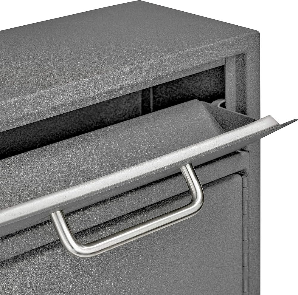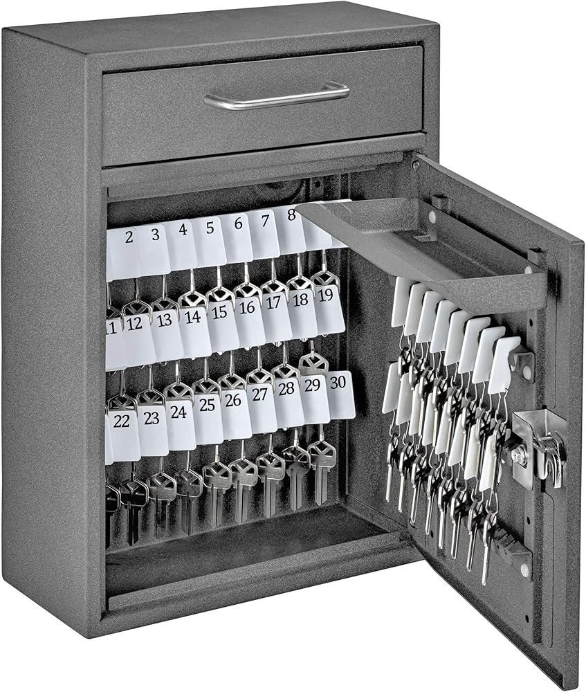 The 50 position Key Boss locking security key cabinet dropbox by Mail Boss features six adjustable key rails that can neatly and easily store up to 105 keys. The Key Boss includes 1-50 numbered key hooks that attach directly to the adjustable key rails. The innovative patented key drop bin receives deposited keys and prevents them from falling on stored keys while deterring hand fishing. 16 gauge powder coated galvanized steel and commercial grade locks make the Key Boss a true security key cabinet. Backed by the Mail Boss Limited Lifetime .