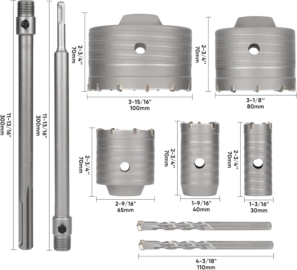 9PCS Concrete Hole Saw Kit with SDS Plus Max Bit Shank for Cement Brick Wall, Masonry Hole Saw Set 30 40 65 80 100 MM, Concrete Drill Bit Set for Brick, Cement, Stone