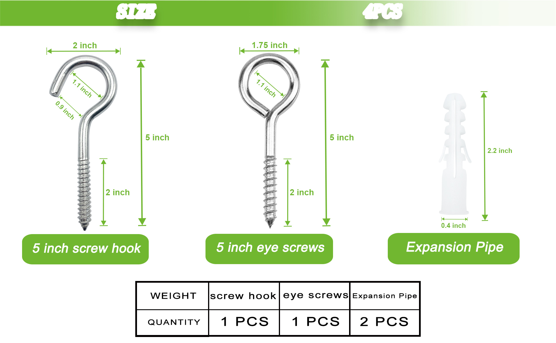【خطافات عين 5 بوصة مع أنابيب】حجم دبوس العين: 5 بوصة (طول) × 1.8 بوصة (عرض)، حجم خطاف العين المفتوح: 5 بوصة (طول) × 2 بوصة (عرض)، حجم الأنابيب: 2.26 بوصة × Φ0.47 "، قطر العين الداخلي: 1.15"، طول الخيط: 2"