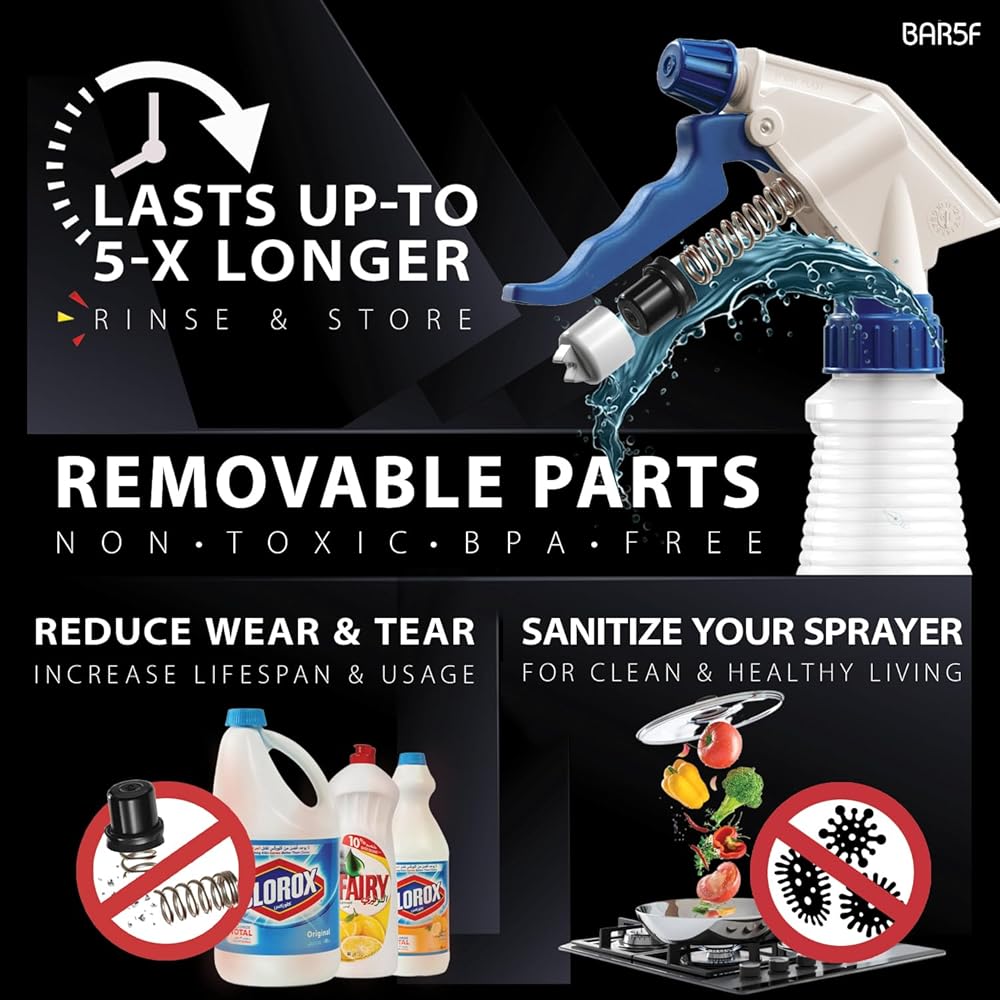 • متعددة الاستخدامات: هذه الرشاشات مثالية لتنظيف أسطح العمل والأرضيات والحمامات والمطابخ والمزيد. يمكن استخدامها للتنظيف باستخدام منظف مركز ومتعدد الأغراض، أو منظف المطبخ والحمام، أو منظف الزجاج، أو أي محلول آخر.