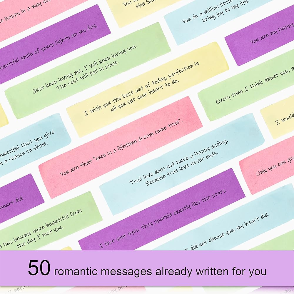 50 رسالة مكتوبة - تأتي عادةً مع قطع ورق فارغة. ولكن لدينا رسالة رومانسية مكتوبة بالفعل على قطعة من الورق. ليست هناك حاجة لقضاء وقت طويل لفتح كل كبسولة وإعادة إغلاقها لاحقًا.