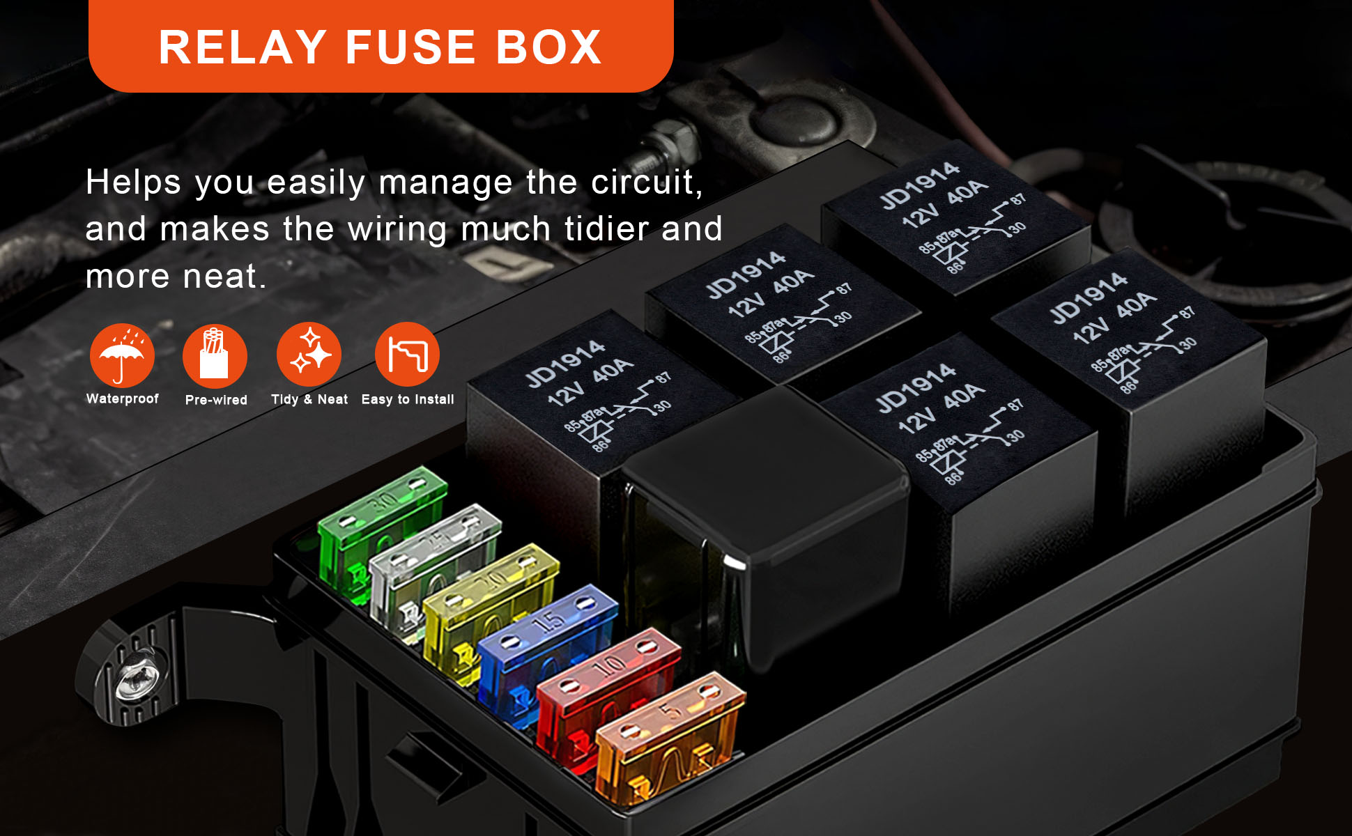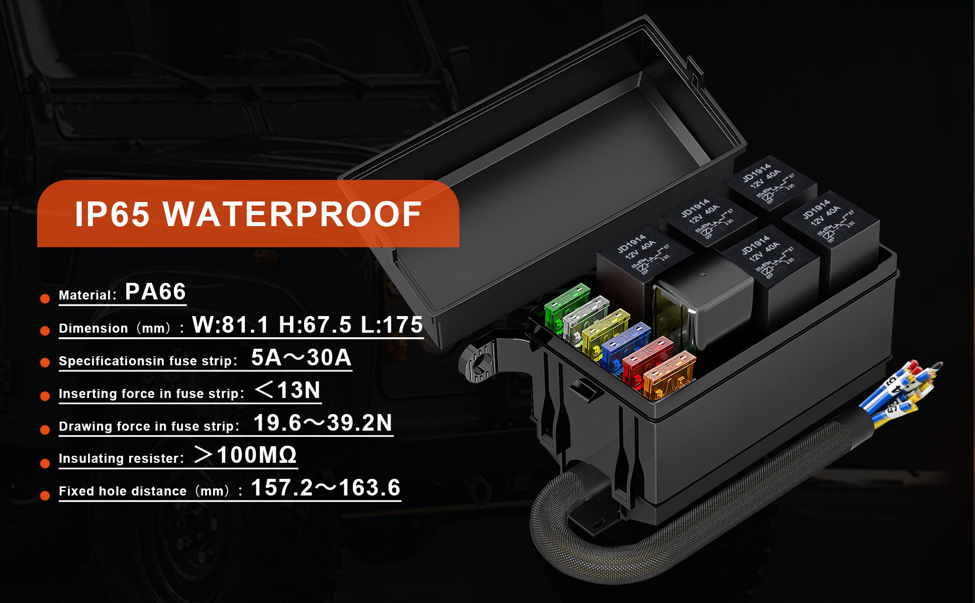 مادة متينة: صندوق Jekruiet 12V Fuse and Relay Box مصنوع من النايلون المتين والموثوق 66 ويتمتع بتصنيف IP65 المقاوم للماء.